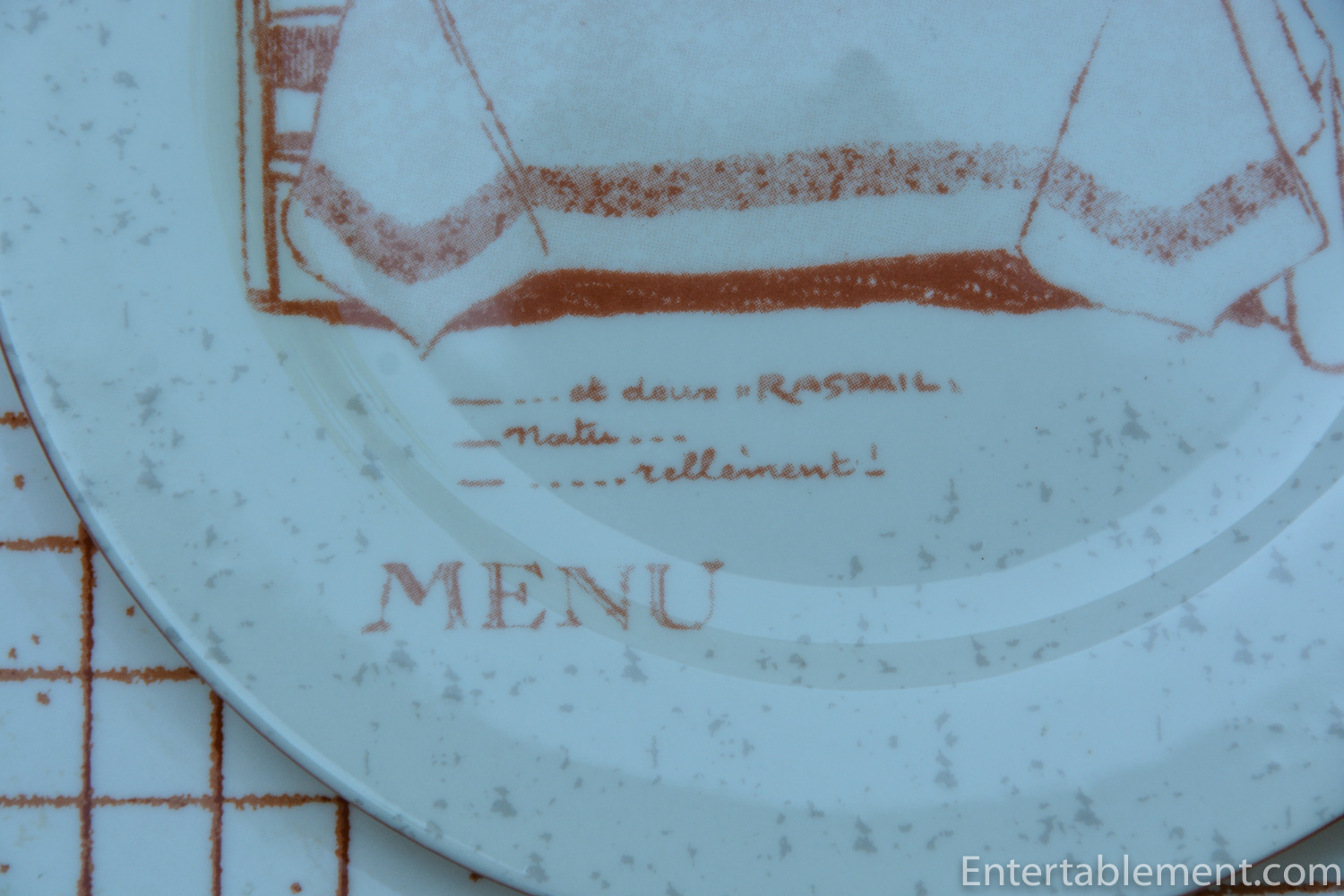 French Menu by Sabatier is the pattern. I don’t know anything about the origin or when it was produced, but it comes up from time-to-time on eBay. (In fact, there are eight salad plates listed right now for $16.00. And one set of four dinners and four salad plates for $69. Giddy up, anyone who is interested!) The dinner plate depicts a handwritten accounting of the meal partaken of by Madame Perrin Doit.