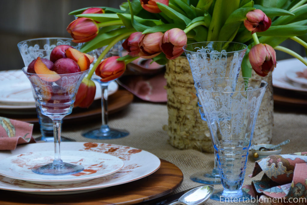 The footed compotes holding the plums are the champagne/tall sherbet. I also have octagonal salad plates in the pattern and look forward to using those in another setting.