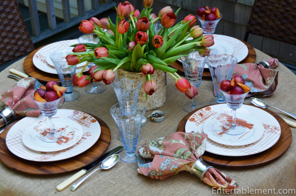 It was not my intention to set a table with these plates last summer. I had managed to purchase eight of the dessert plates, but had only four of the dinner and was waiting for another four to present themselves. I had thoughts of preparing a French meal and perhaps throwing a tres elegant dinner party.