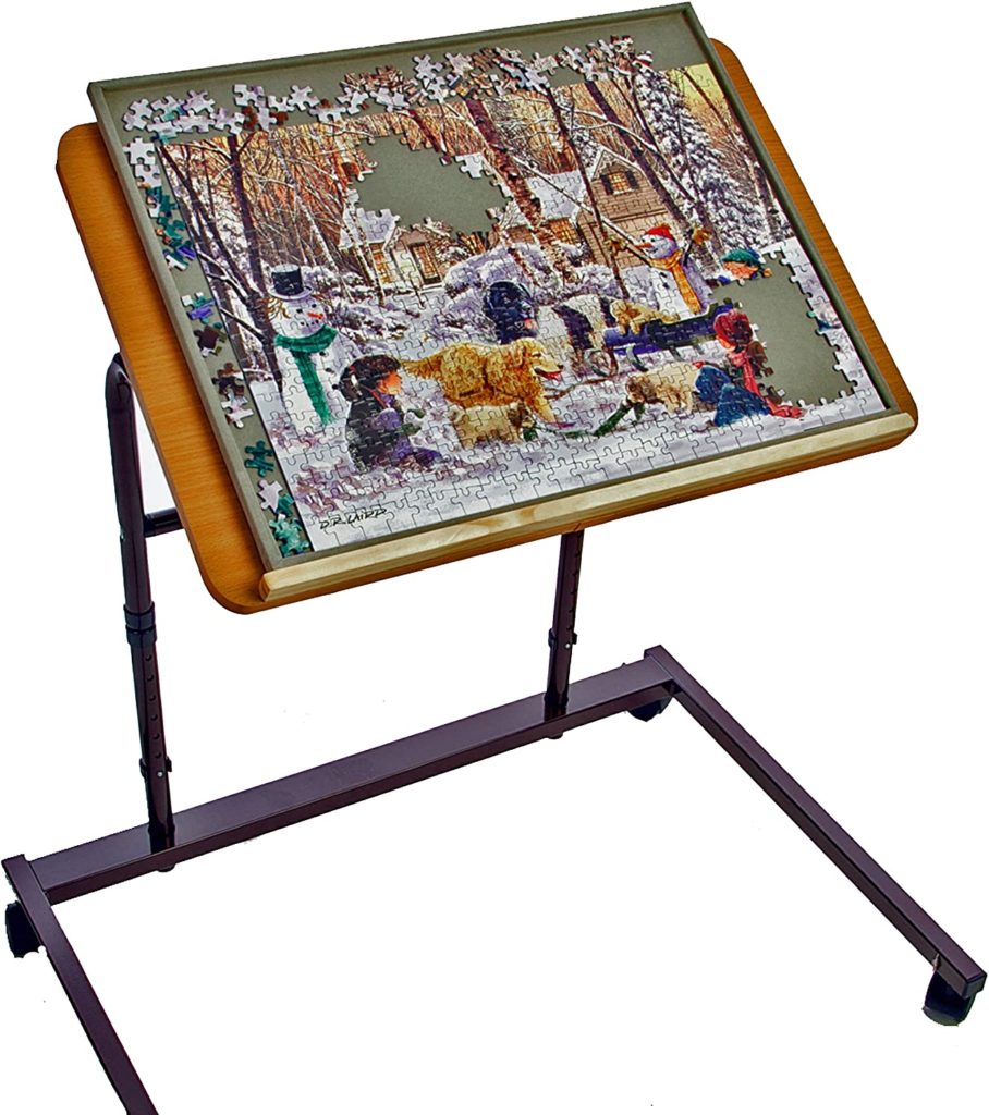 The only downside to puzzles is they can be backbreaking. A couple of years ago I invested in a jigsaw table. I see they’re still available on Amazon.com, though they have gone up a bit in price. What I like about this one is the adjustable angle, and the fact it’s mounted on wheels, so it can be easily moved out of the way. I purchased the board as well, which comes with a Dundee-proof and Moxie-proof cover. No more missing pieces (one of my absolute pet-est of pet peeves).