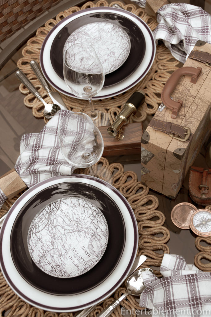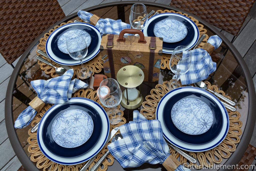 The oversized placemats frame Brasserie blue-banded dinner plates and appropriately named Pacifica dinner plates, both from Williams Sonoma. The nautical napkins complete the theme.