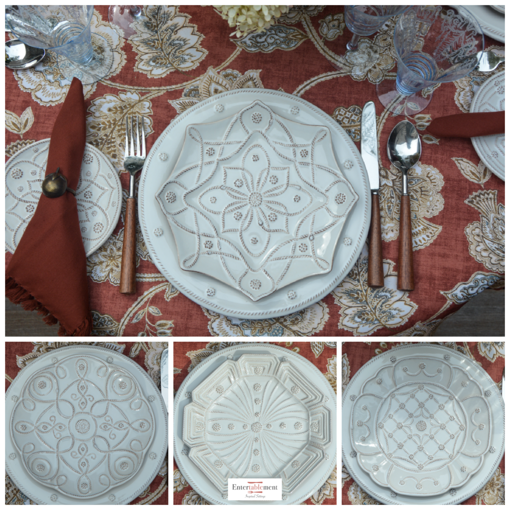 I pulled out the full Monty of Juliska Berry and Thread dinnerware, along with some pieces in the sister pattern, Jardins du Monde. The latter is named after four famous gardens in Europe: Landriana in Italy, Villandry in France, Alcazar in Spain, and Heligan in England. There are four salad plates in different patterns and shapes.