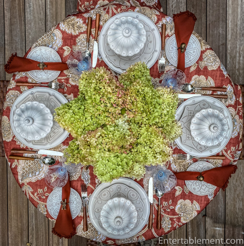 I played around with a couple of different tablecloths to see which one best set off the hydrangea; they were clamouring to be front and centre. The rusty tones in this paisley cloth from HomeSense ago struck me as the best choice.