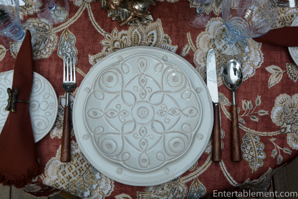 With the boisterous tablecloth and intricate patterns on the plates competing for attention, I chose a subdued, solid coloured napkin in a toning shade of rust. Bronze napkin rings in the shape of vegetables behaved very discreetly. You’d barely know they were there.