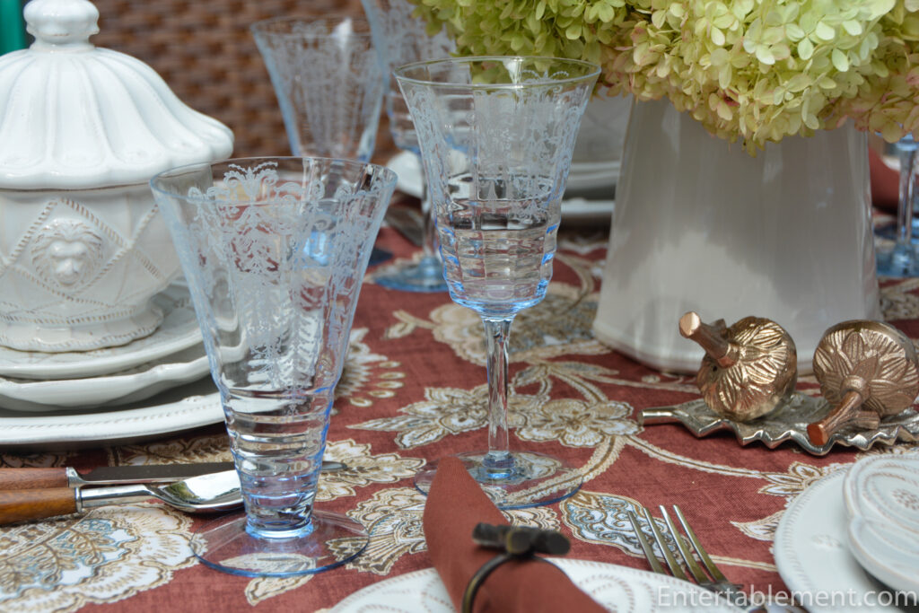 Elegant Depression iced tea and water goblets in the Cleo blue pattern by Cambridge picked up the faint blue accents in the tablecloth.