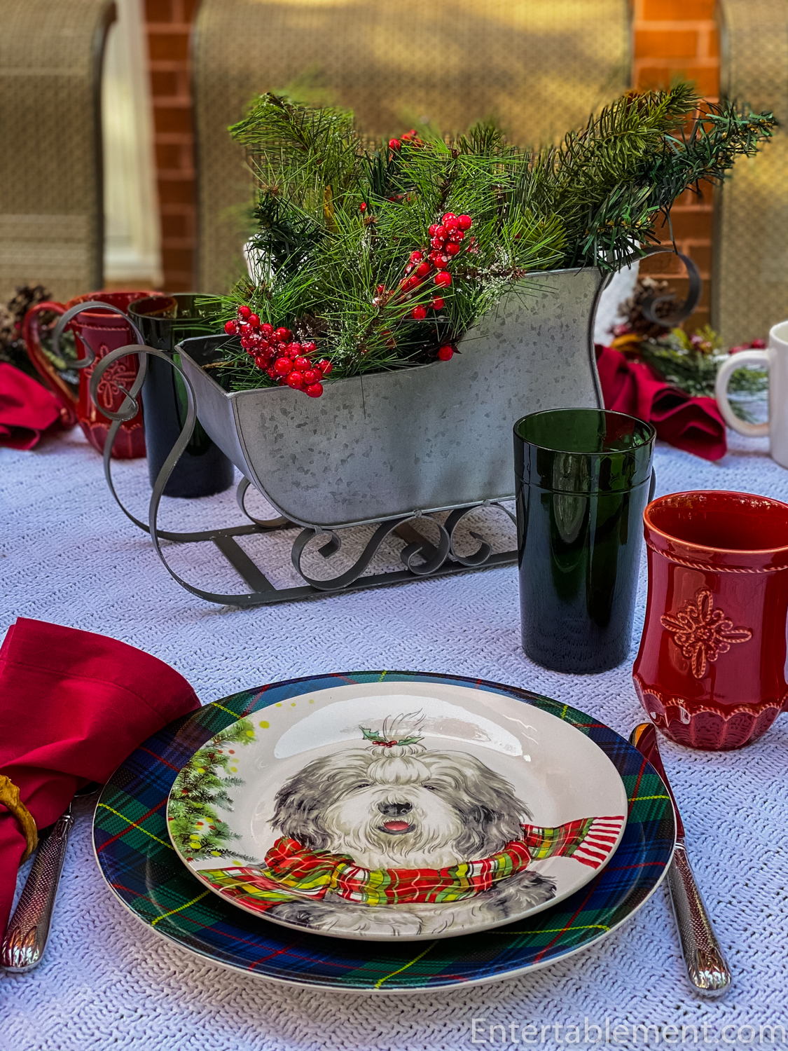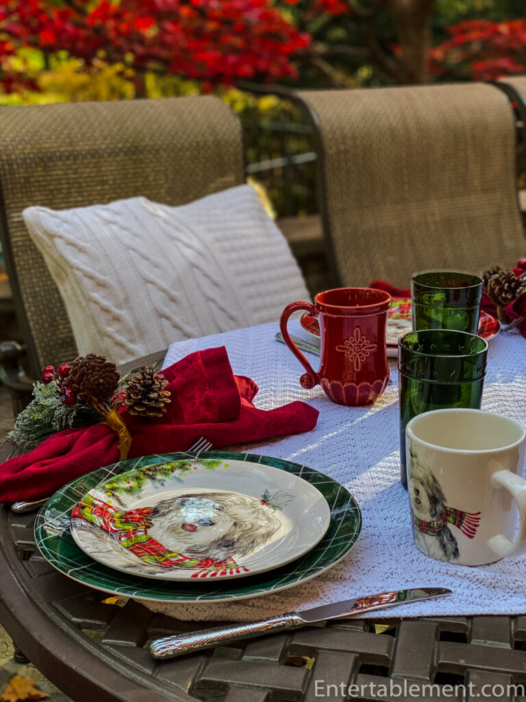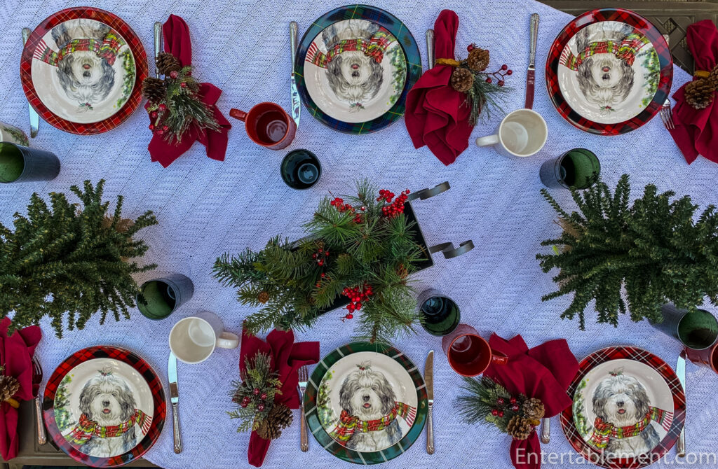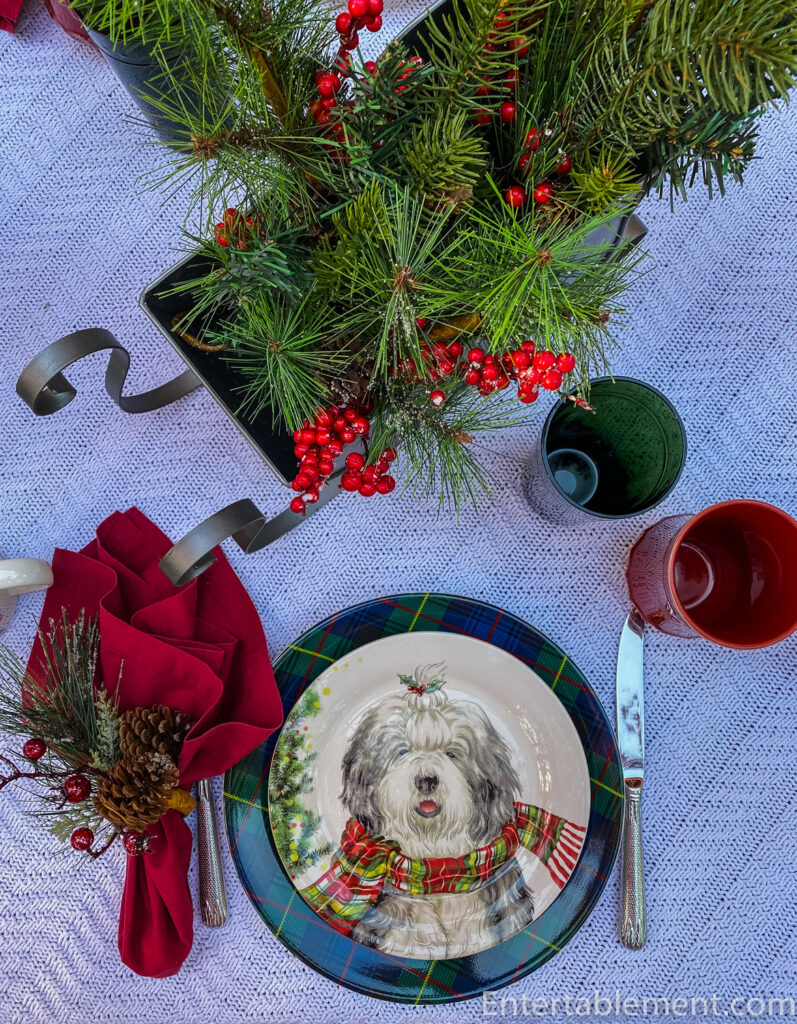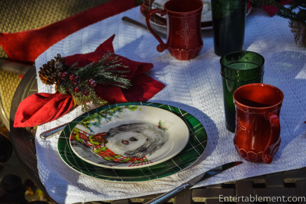 Clearly, the table had to have red accents. Red transferware on a creamy quilt? Too muted, I decided. Red stemware? Those get regular outings during the season. Wait! I looked at the mug of coffee I was sipping. That’s it! Shaggy dogs with tartan scarves it is.