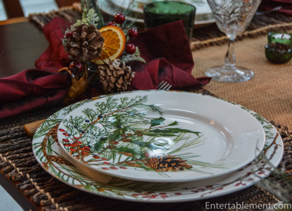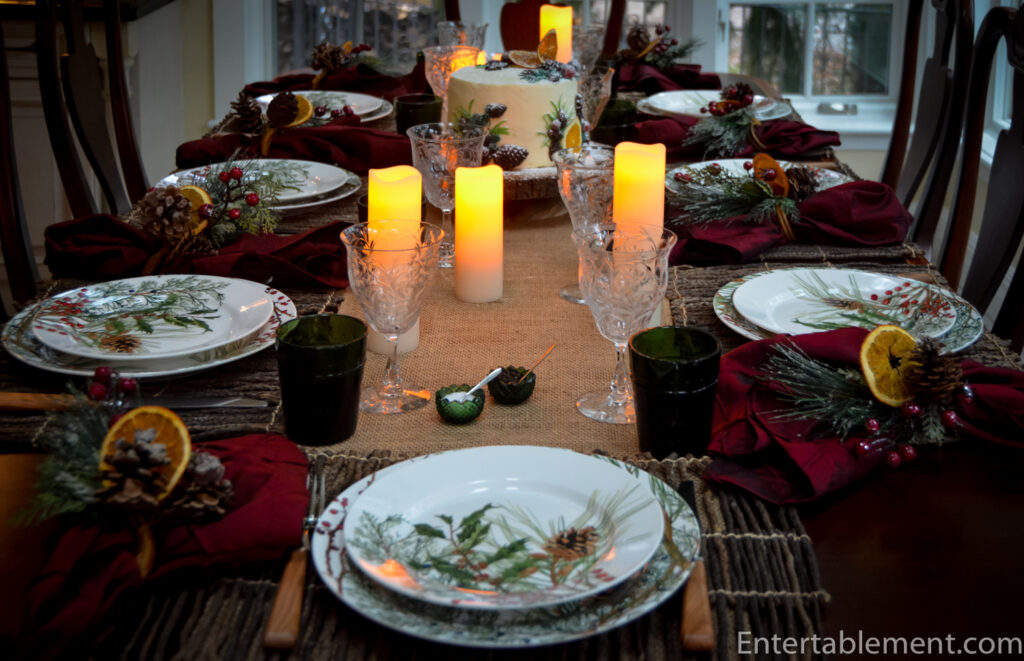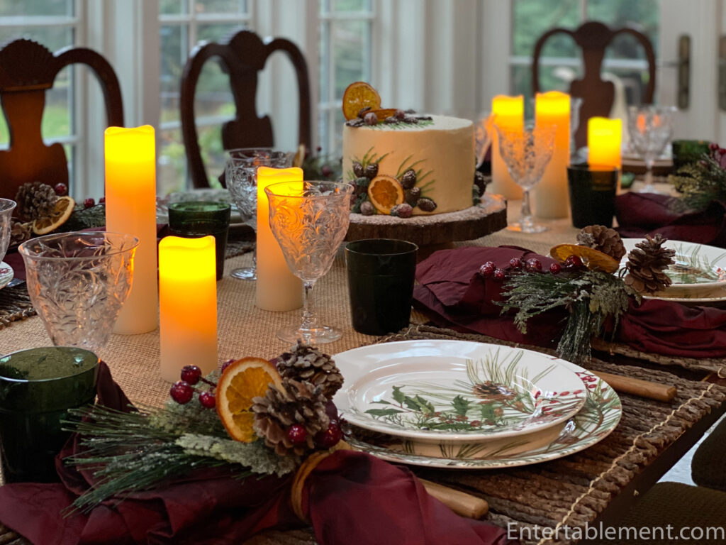 Love the way you have styled the delicious looking cake to coordinate with the plates. The festive napkin rings also pick up the foliage in the dinner and salad plates so very well. A suggestion…perhaps add evergreen candle rings to the pillar candles to carry the theme a little further. Love the addition of the dried orange slices to the napkin rings to tie in with the orange flavoured cake! Beautifully done table setting!