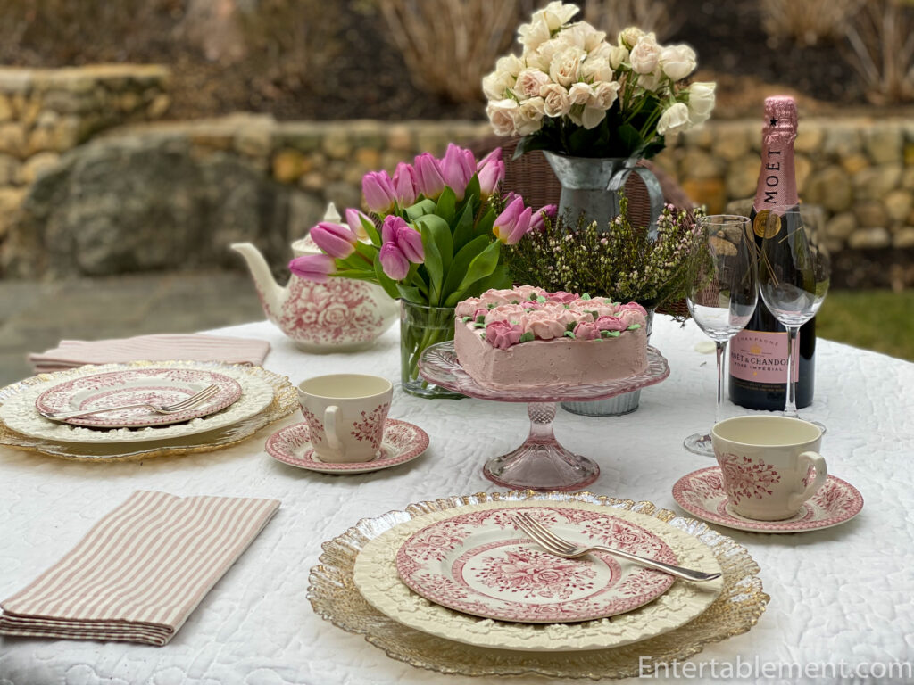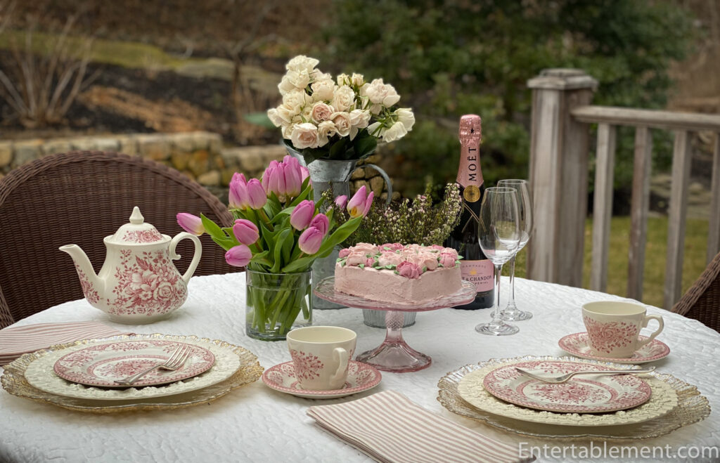 Add in pretty pink china and we have a lovely (albeit chilly) setting for Valentine’s Day. The plates and cups are part of a tea set in Kew Pink by English Ironstone Tableware (eBay). I wasn’t able to glean much about the pattern, other than English Ironstone Potteries became English Ironstone Tableware in 1973 before going into receivership in 1994. So these pieces are post-1973.