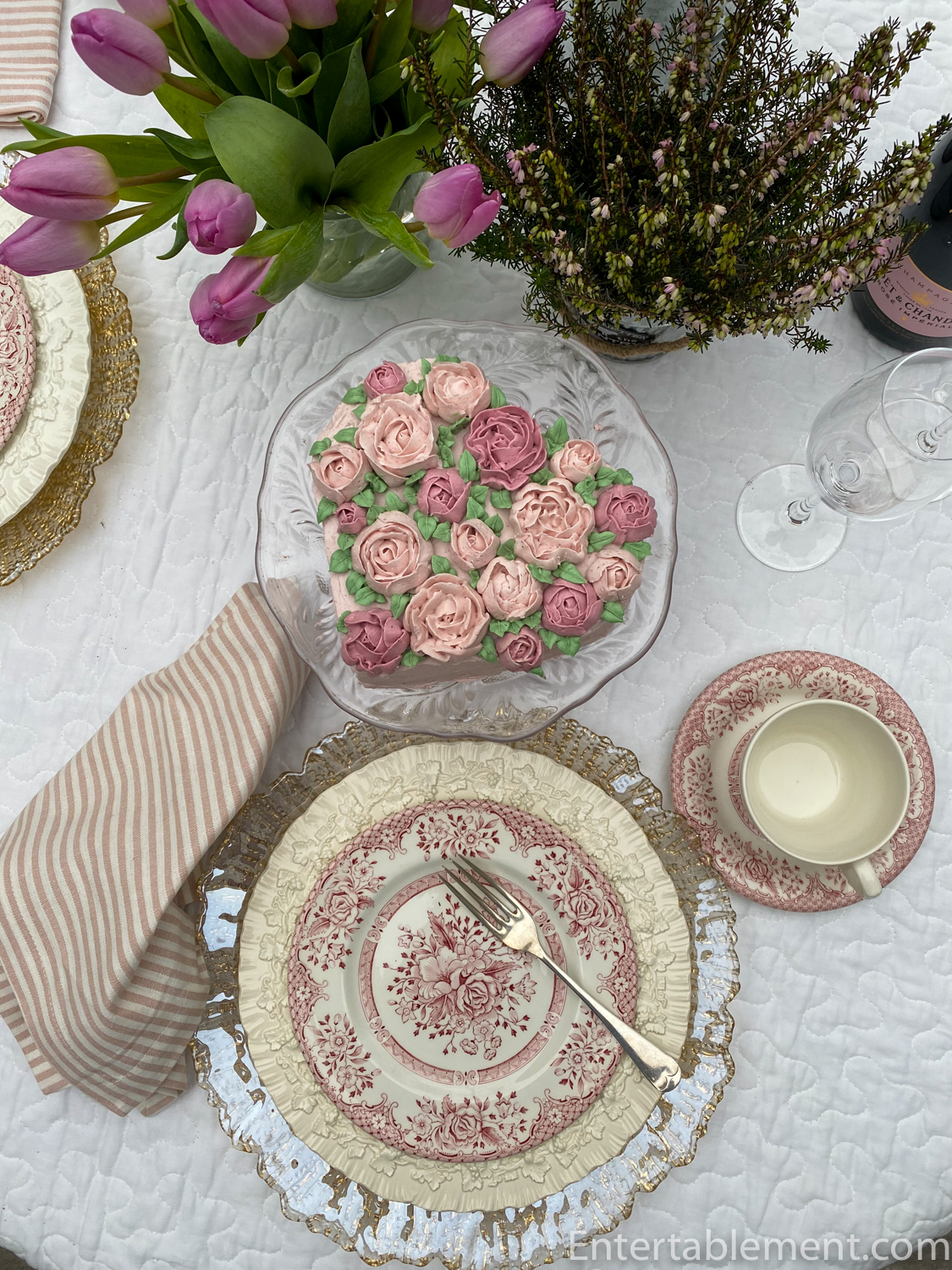 LOVE the ironstone rose pattern dishes! Pretty table and beautiful cakes.