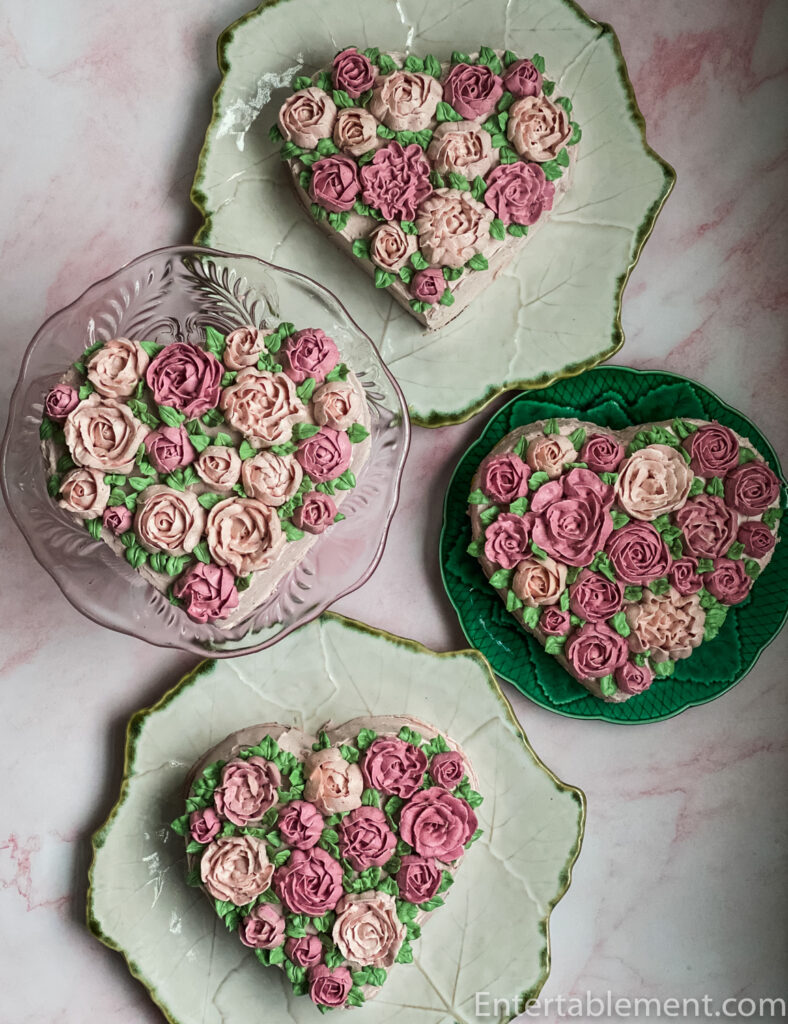 Chocolate and roses are traditional Valentine’s Day fare. Combining them in a cake is the best of all possible worlds – served with tea, and augmented with pink champagne, of course!