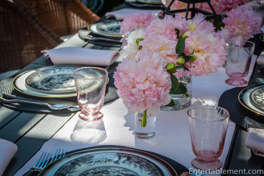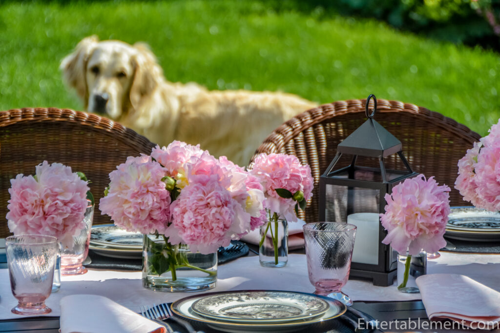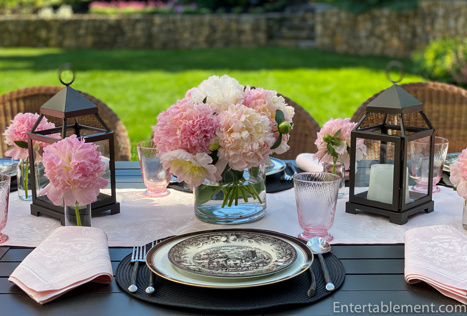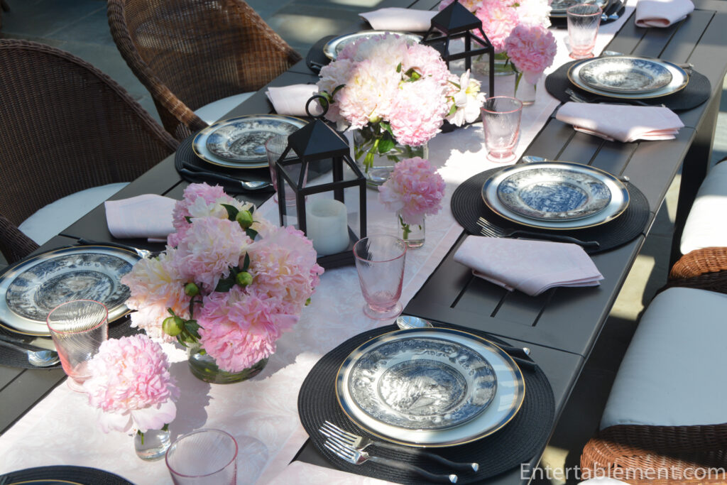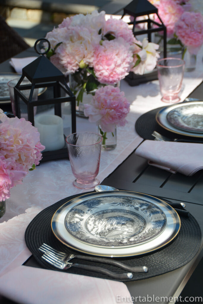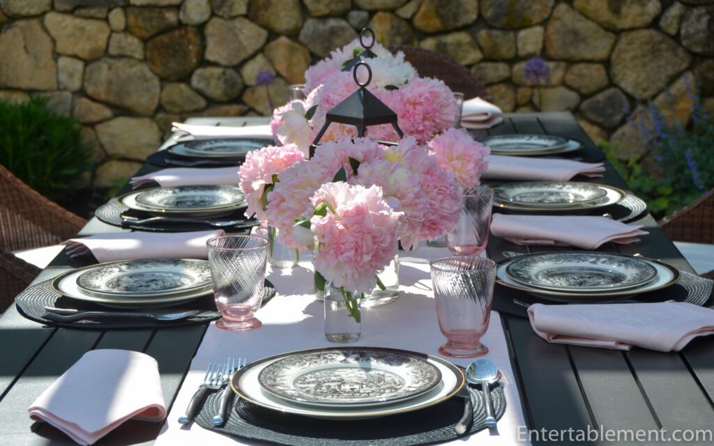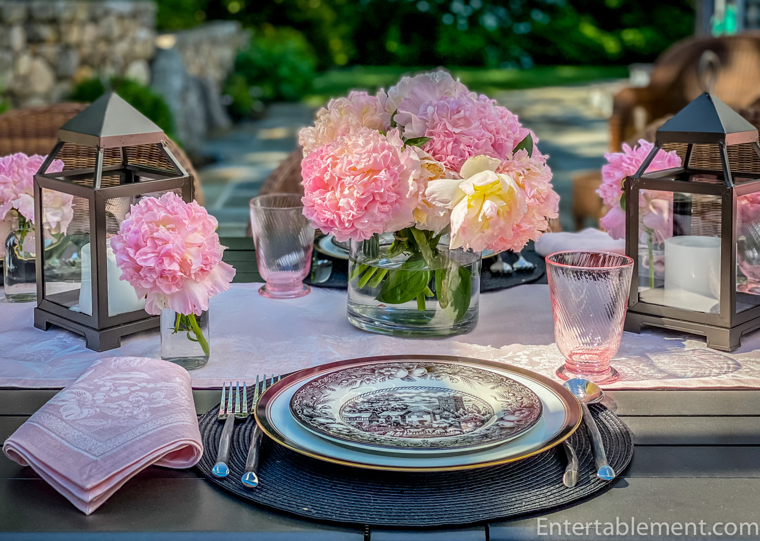 Dear Helen, Simply lovely. I tried this combination using ‘Josephine’ from Grace’s Teaware and unknown pink goblets, with Monique Lhuillier blush linen serviettes. (Looks like you used pink damask with matching runner?) It looked good, but not as good as yours. Those Staffy plates reflect the old-fashioned vibe of the peonies. One can never have too many peonies! We are awash, and I did the same as you–cut the first crop and hope for secondary blooms. Every room has their scent; even the terrace table has a bouquet. Onward to roses!