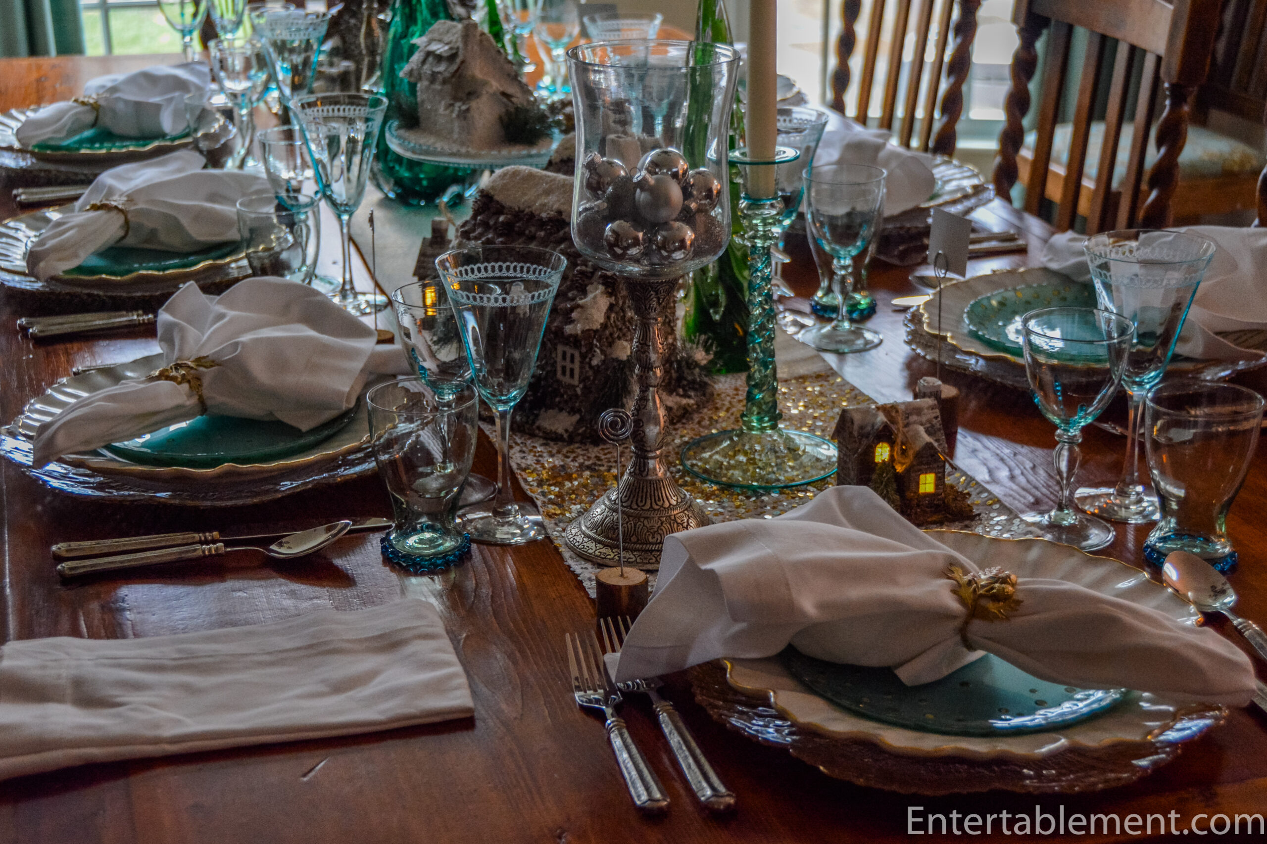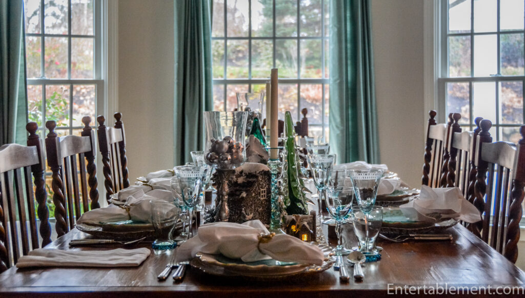 Once the silvery tones of the rustic houses joined in, I added the tall, glass hurricane style candlesticks and filled them with silvery balls. That led to the choice of pewter flatware.