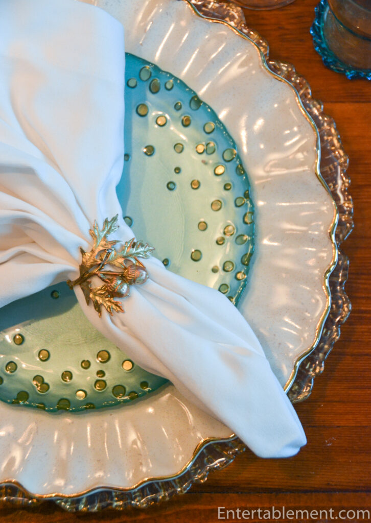 That left me pondering what to do for winter. So far, the aqua theme had yielded casual, everyday settings, so I was a bit startled when it veered to glitzy with the discovery of Aqua Dot by Pier 1. I’m not usually a glitter fan and wasn’t sure how I’d style the plates, but Pier one also had the sparkly runner… I began to see possibilities. I went home and dug out my ruffled edge gilded chargers and topped them with gilded and ruffled dinner plates from Williams Sonoma.