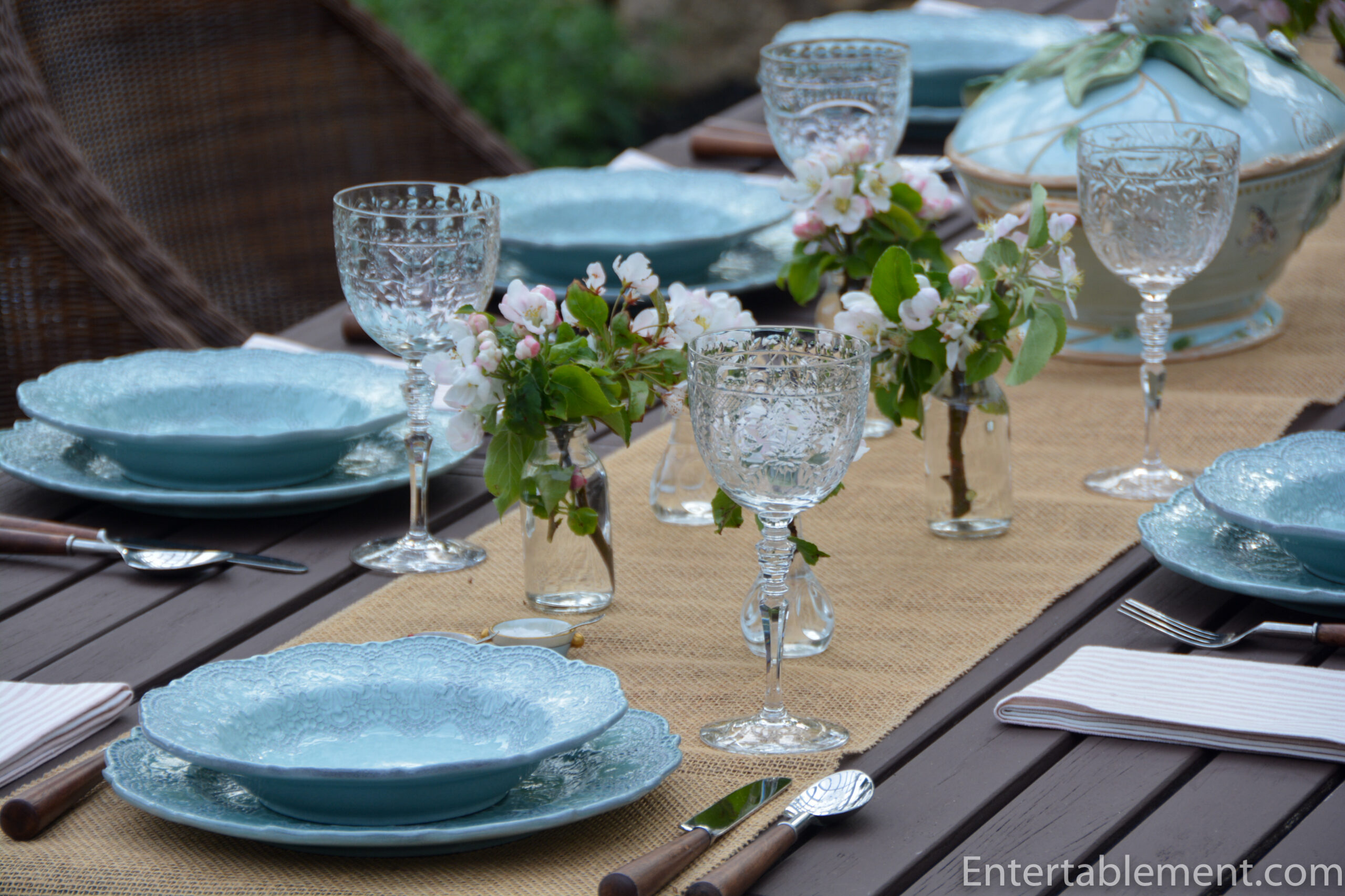 The four-season aqua adventure was easy at first. I’d breezed through spring with my trusty Merletto Aqua by Arte Italica, a Toulouse tureen from Fitz & Floyd, and accenting the table with soft pink napkins and apple blossoms from a generous neighbour’s tree. Springlike indeed.