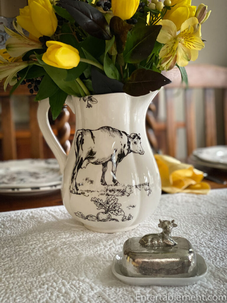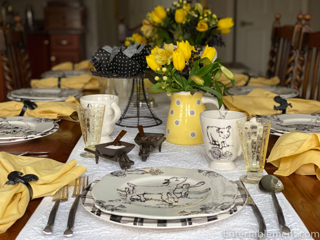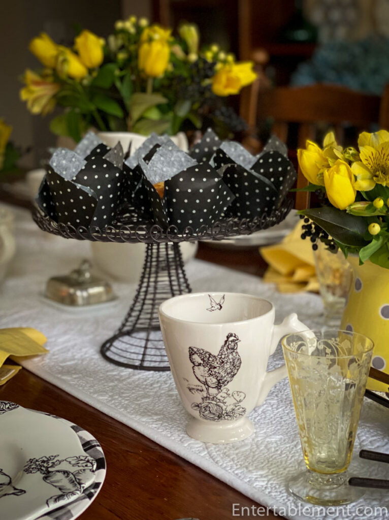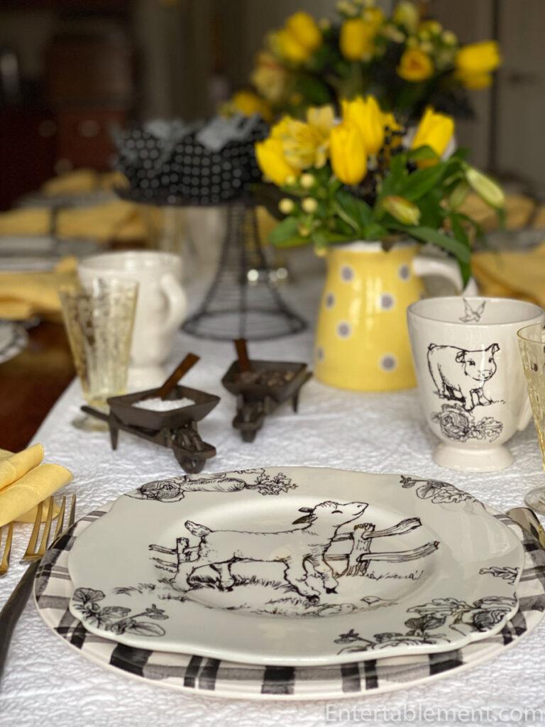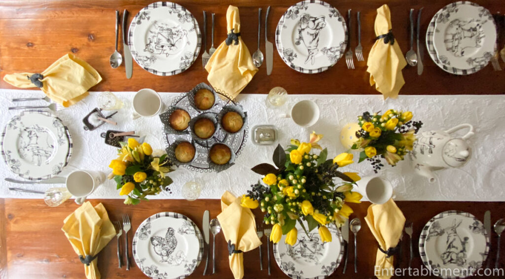 Helen, this barnyard toile is so cute – even the name “Barnyard toile” is cute (minus the rest of the handle). How can you not smile at “barnyard toile”? Love them on the plaid plates and with the yellow napkins and flowers. And thank you for clearing up the mystery of fractals. Now how to use the word in a sentence as it relates to tablescaping so I can add it to my vocabulary… Hmmm. “The salad plates had a beautiful fractal-like pattern set on a background of midnight blue…” lol. Kidding aside, your table is lovely and the muffins look delicious! Re those Maxcera bunny plates… I have been trying on and off for years to find some dinner plates to match my salad plates. I saw some at Replacements a couple of years ago for $25.99. Yikes. Good luck with the hunt and I hope everything is well with you! Take care!