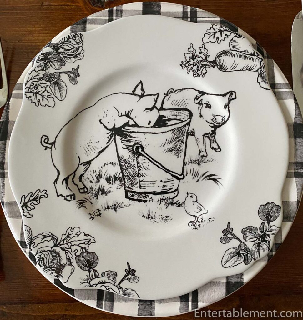 Can anyone tell that as a child, I read and reread Charlotte’s Web by author E B White, illustrated by Garth Williams, until the binding came apart? In fact, the drawings on this tableware are reminiscent of those by Garth Williams. He also illustrated the Little House series by Laura Ingalls Wilder, another series I read over and over.