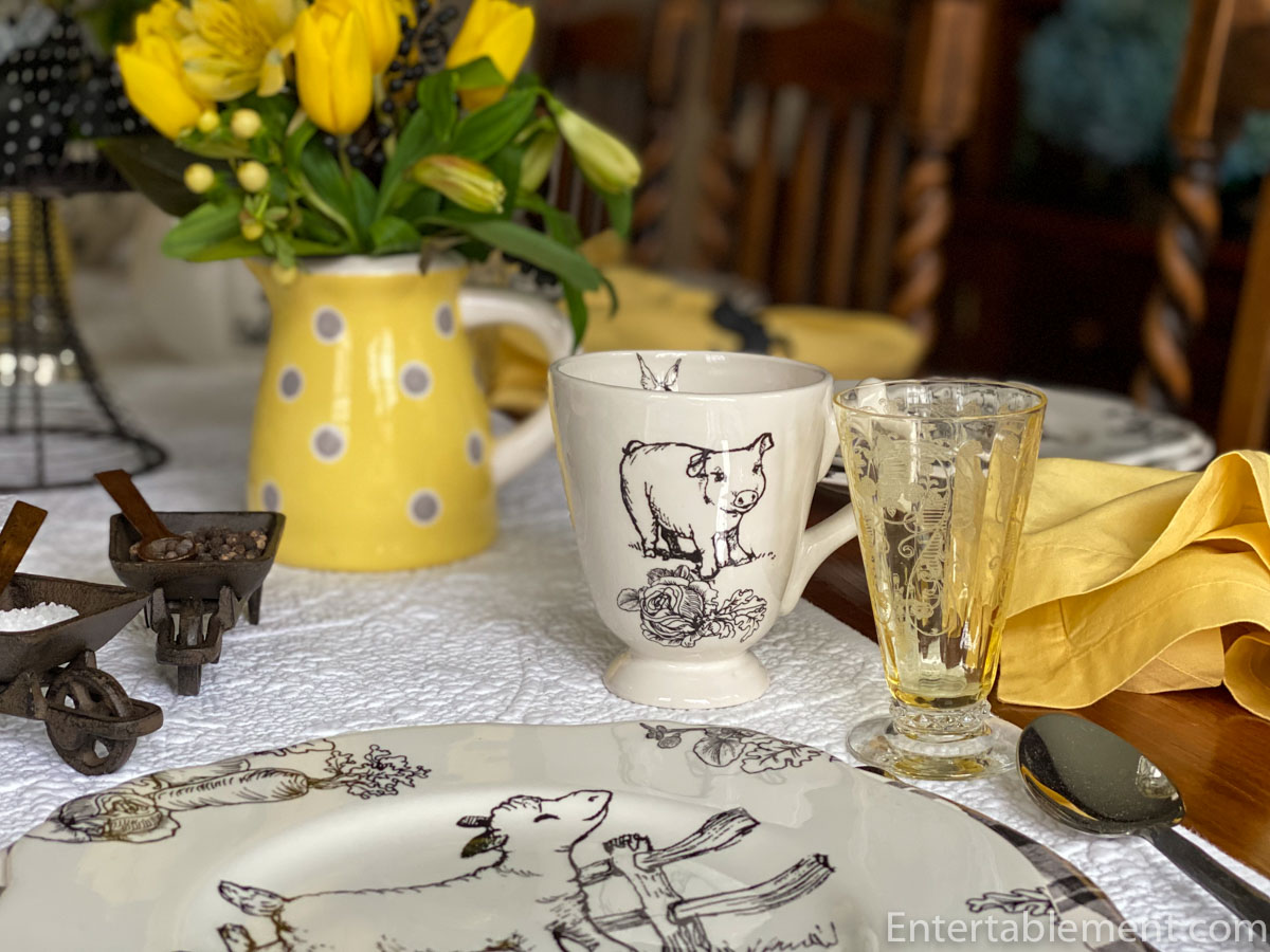 Helen, this barnyard toile is so cute – even the name “Barnyard toile” is cute (minus the rest of the handle). How can you not smile at “barnyard toile”? Love them on the plaid plates and with the yellow napkins and flowers. And thank you for clearing up the mystery of fractals. Now how to use the word in a sentence as it relates to tablescaping so I can add it to my vocabulary… Hmmm. “The salad plates had a beautiful fractal-like pattern set on a background of midnight blue…” lol. Kidding aside, your table is lovely and the muffins look delicious! Re those Maxcera bunny plates… I have been trying on and off for years to find some dinner plates to match my salad plates. I saw some at Replacements a couple of years ago for $25.99. Yikes. Good luck with the hunt and I hope everything is well with you! Take care!