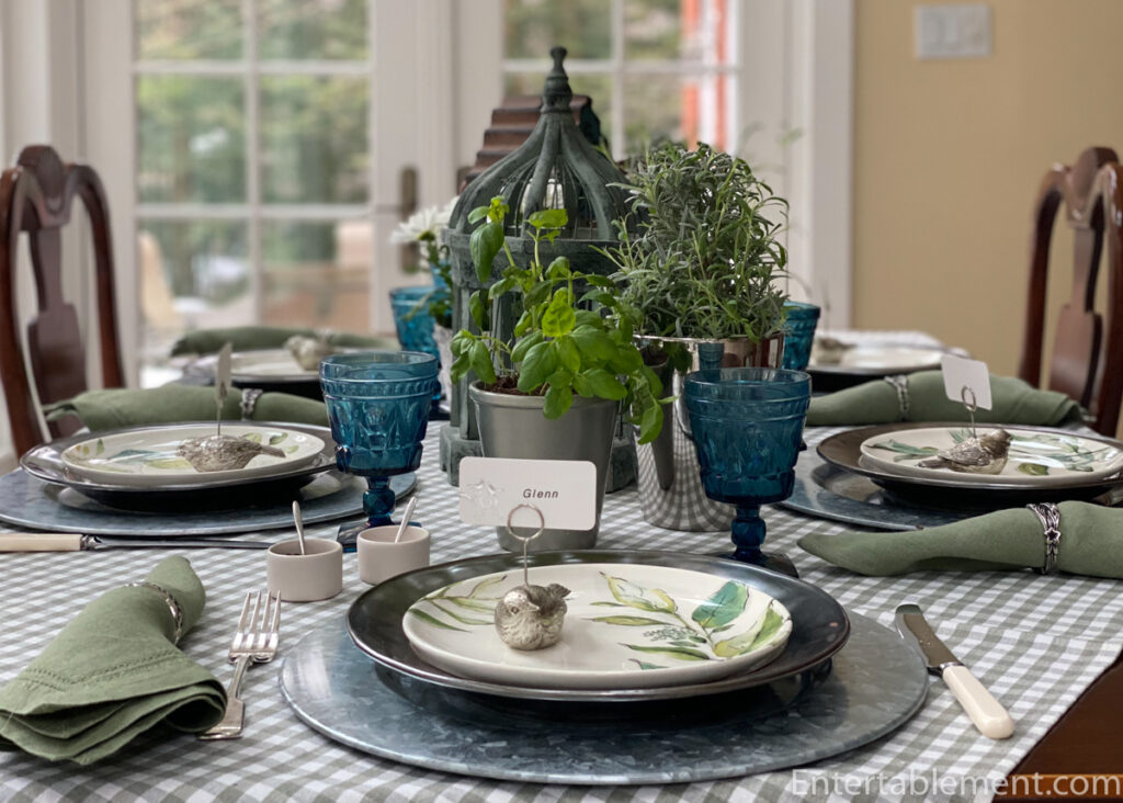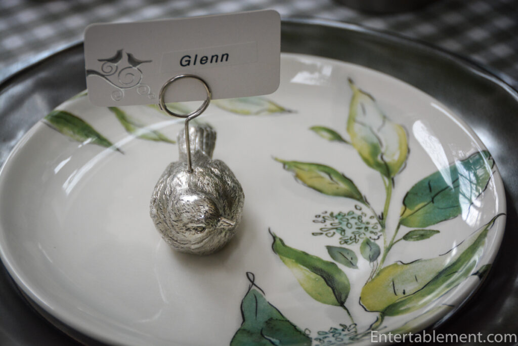I love that turquoise birdhouse and the pewter bird place card holders. Such a pretty spring-like table.