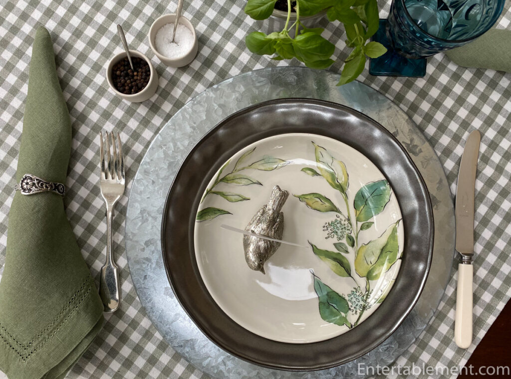 Watercolour Botanicals salad plates came from Pier One a few years ago. The soft, tranquil shades of sage green and turquoise are very appealing. So I styled them with Emerson pewter-rimmed plates from Juliska.