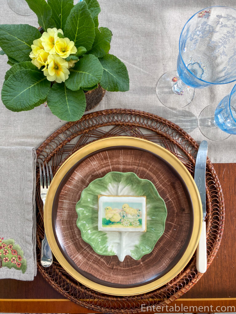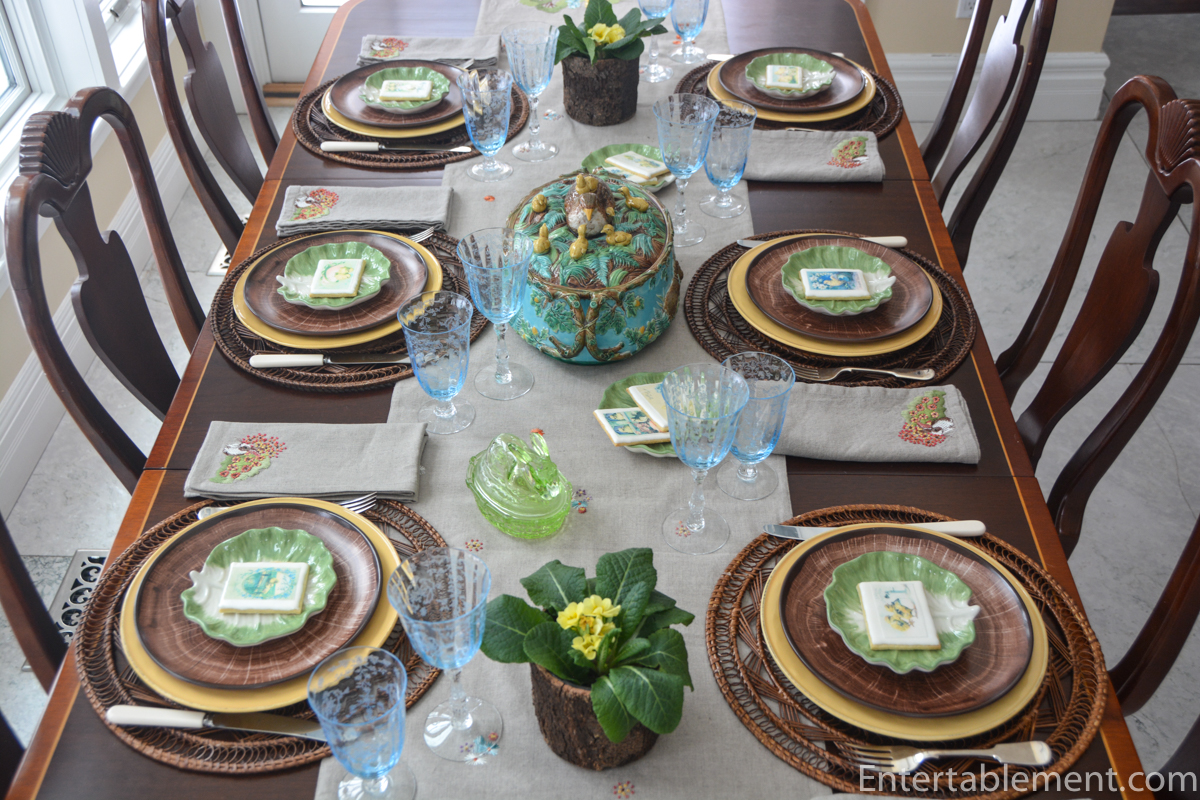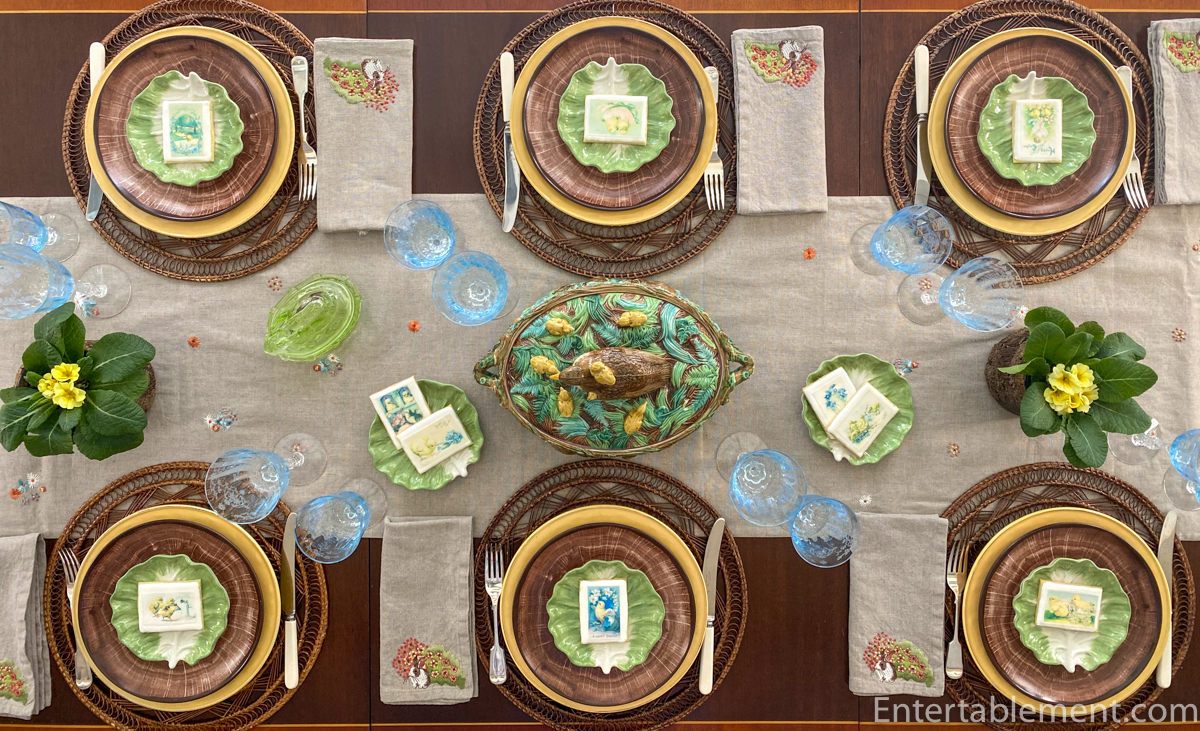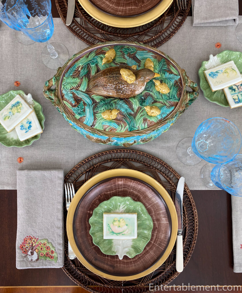 The soft, toasty shade of the linen runner and napkins encouraged a woodsy theme. Martillo dinner plates in Mango (Pier 1) hold wood-grained ceramic salad plates (Restaurant Supply Store) topped with cabbage leaf canape plates (English Garden by Certified International).