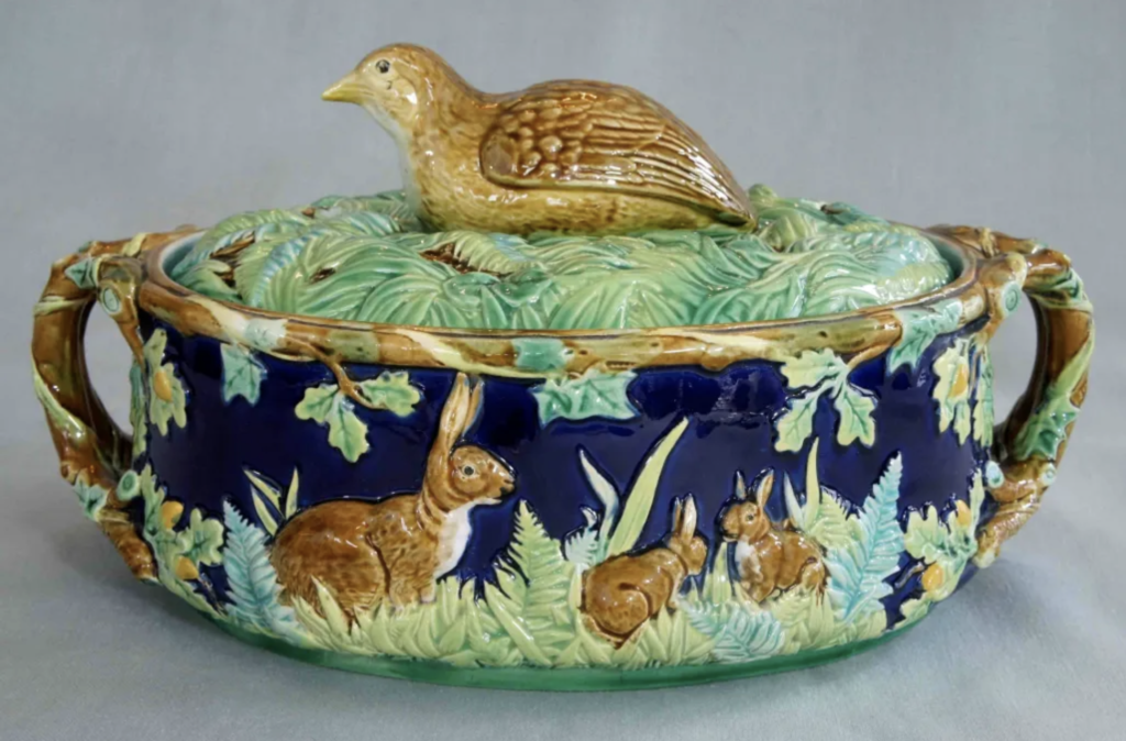 A flock of babies surrounds Mama Quail on the lid of this Victorian game bird dish by George Jones.