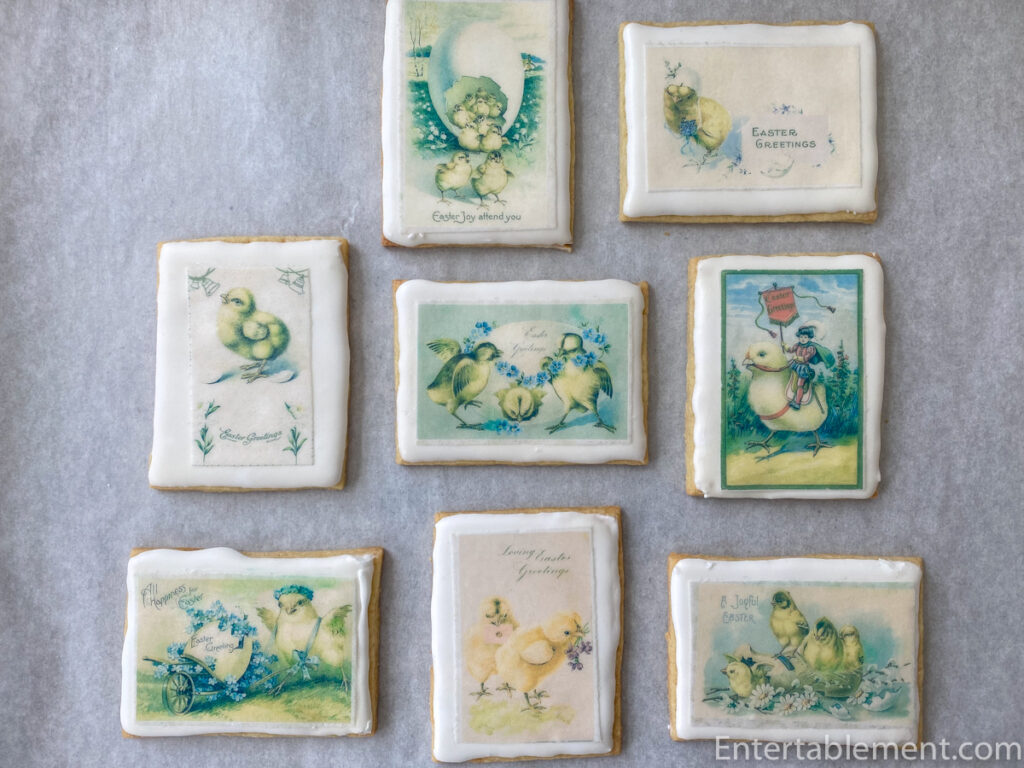 - Apply a thin coating of clear piping gel or corn syrup to the underside of an edible wafer. Gently press it onto the cookie’s surface, smoothing with a fondant smoother or spatula. Turn upside down onto a parchment-lined baking sheet to ensure uniform adherence to the transfer paper. Repeat with the remaining wafers and cookies.