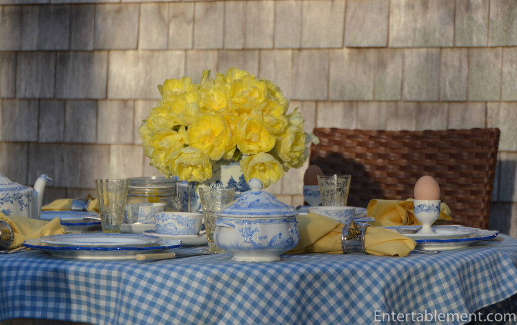 Dear Helen, When I really feel spring is here, I drag out the Villeroy Casa Azul and blue-and-white embroidered cloth, but as yellow is not a staple in our garden, it’s paired with raging pink parrots and Angelique. I’m looking at those golf ball peonies with anticipation, too. Your palette is fresh, cool, and soothing enough to balance out the mayhem of young pups. When does class start? (I remember a few years ago Mary used bee magnets and Rub-and-Buff for rings; a clever idea that I immediately adopted for adding butterflies.) Thanks for a refreshing look I can copy!
