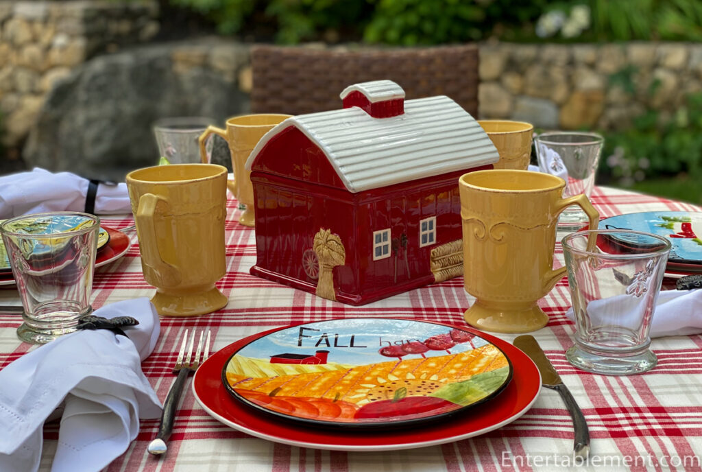 On to the table. A barn-shaped cookie jar from Pioneer Woman picked up a common theme depicted in the Farmer’s Market plates by Certified International.