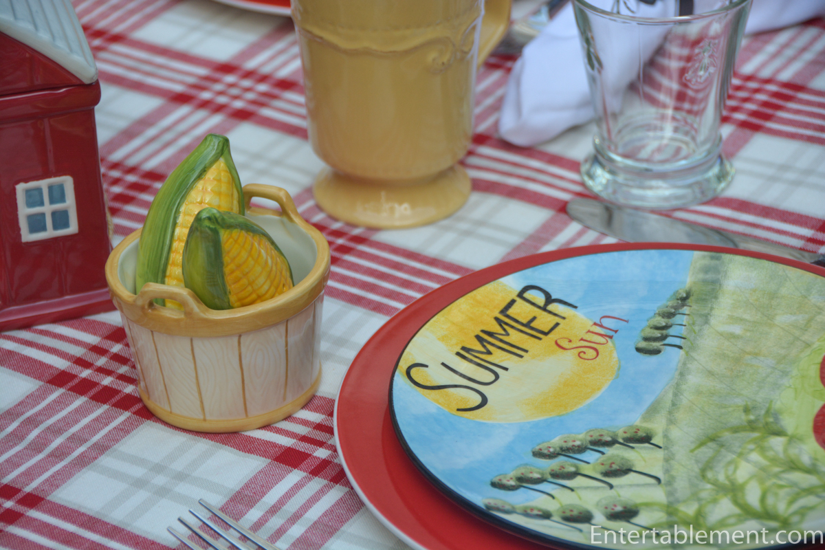 Produce abounds at the farmer’s markets, prompting me to reach for the appropriately named Farmer’s Market plates from Certified International. Let’s begin with Summer Sun’s corn and tomatoes.
