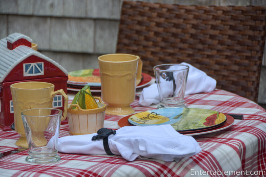 The heat has been something.–43C as we crossed France on our way to the cool coast! So glad we don’t have to endure that here. I remember looking at Pier 1 twig “flatware,” but, it was very difficult to handle because it was so small and round, so I passed. The corn S&P is adorable, and the table is playful, but all that red makes me feel warm. lol