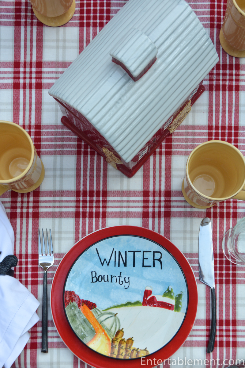 On to the table. A barn-shaped cookie jar from Pioneer Woman picked up a common theme depicted in the Farmer’s Market plates by Certified International.