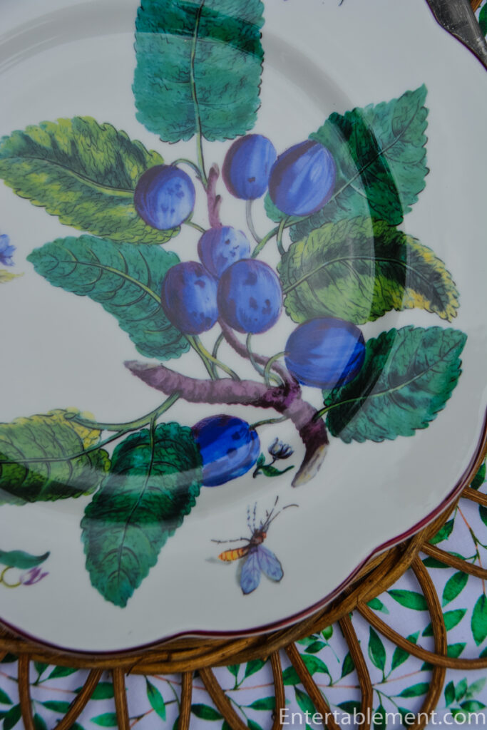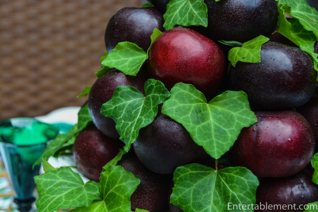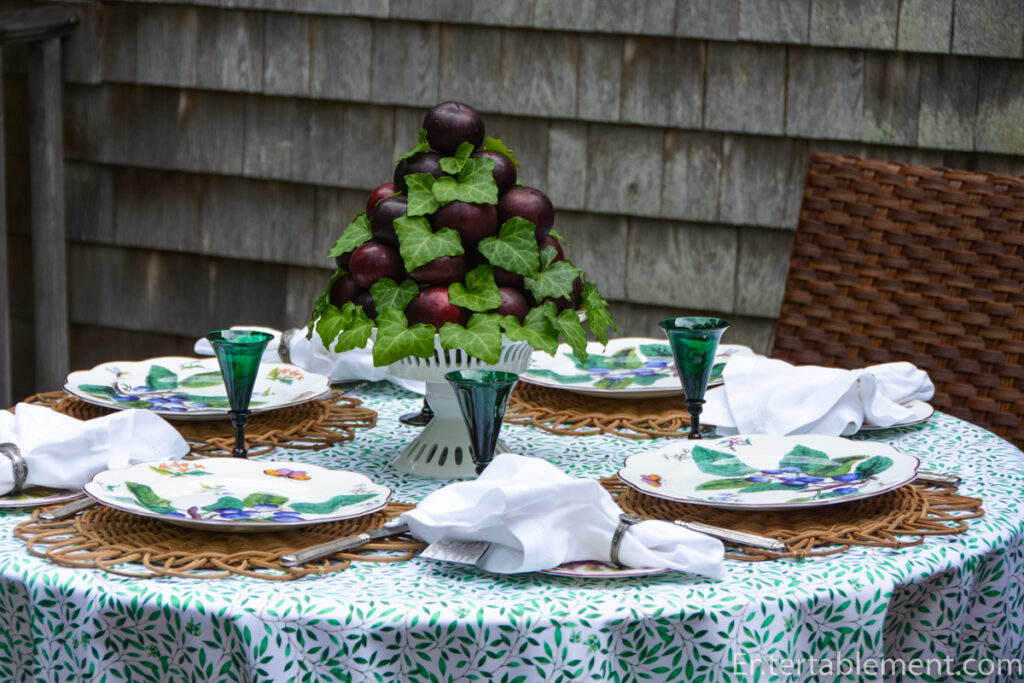 The base is a pierced footed compote from The Enchanted Home. As I planned to dismantle and use the plums once for a Ginger Spiced Plum Streusel Pie once I’d set the table, I simply stacked the plums in a pyramid shape using floral putty for the more recalcitrant participants. Ivy from the garden filled in the gaps.