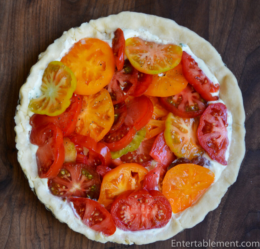 - Line a large plate with several layers of paper towel. Working in batches, transfer the tomatoes from the colander to the paper towels to remove excess moisture. Arrange them in overlapping circles over the tart filling, finishing with a few grinds of pepper. Tuck the excess tart dough around the outside of the tart, shaping it evenly with your fingers as you go; the now double-layer crust edge will rise above the tart ring a bit. You may wish to place it on a baking sheet to catch any drips—bake for 20 minutes.