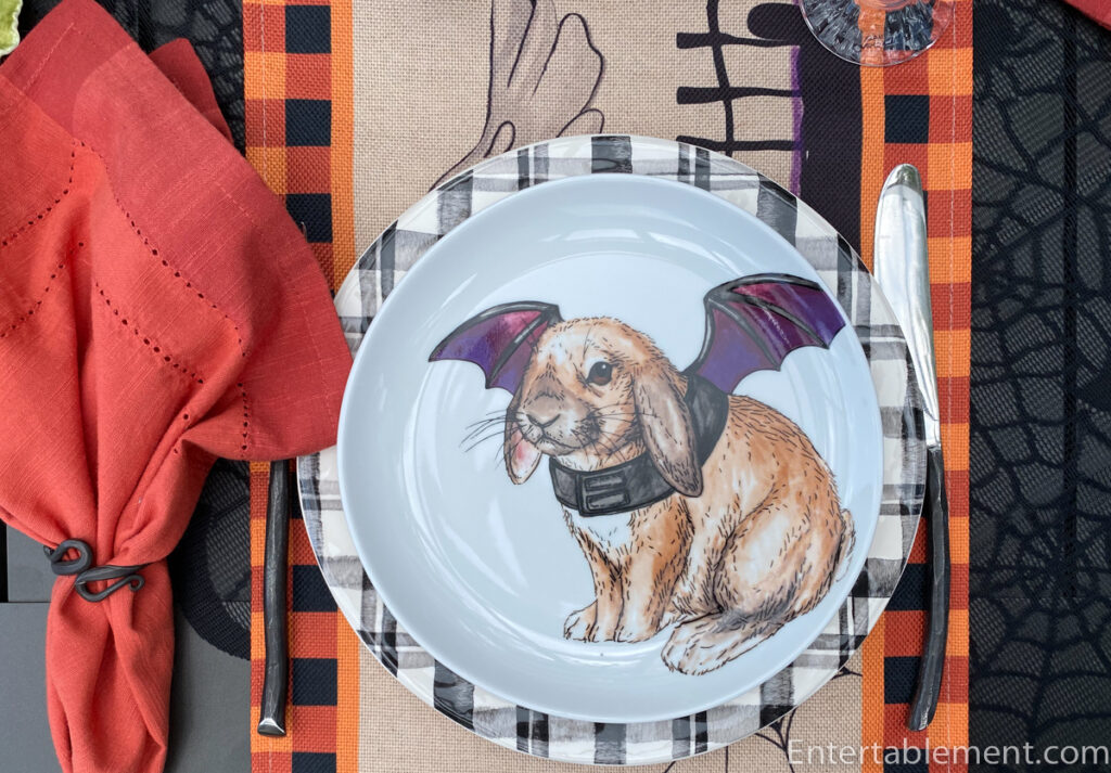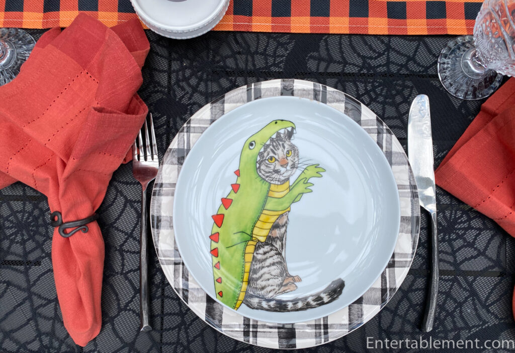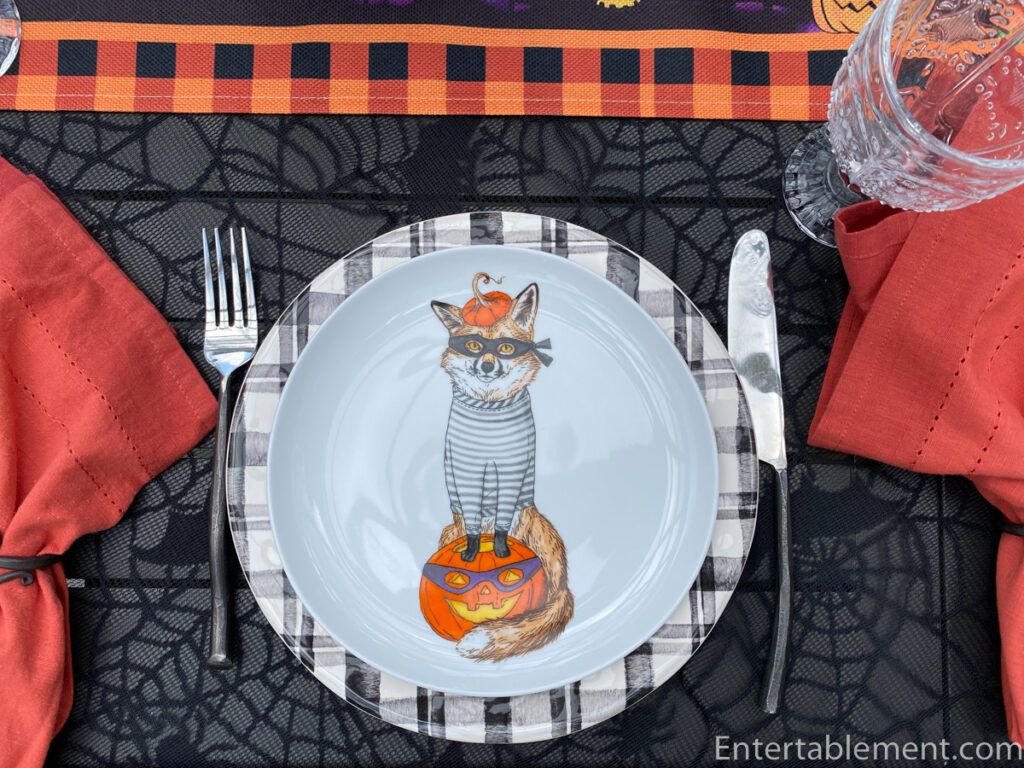 Black and orange are traditional Halloween colours and seemed a good starting place to unify the two sets of plates. I’ve long had the black twig cutlery, and napkin rings from World Market. The orange napkins are a Pier 1 find. So far, so good.
