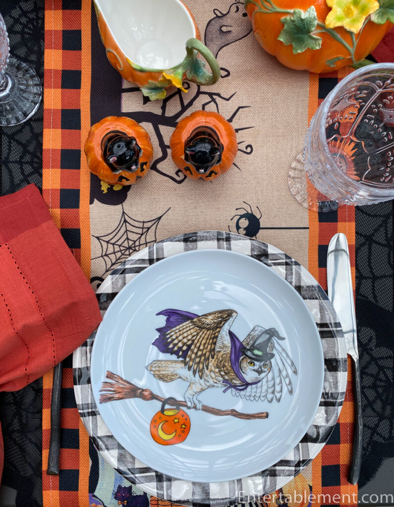 The more recent set of four is still available at West Elm. The unifying feature in the second set is a pumpkin on each plate. From the Witchy Owl…