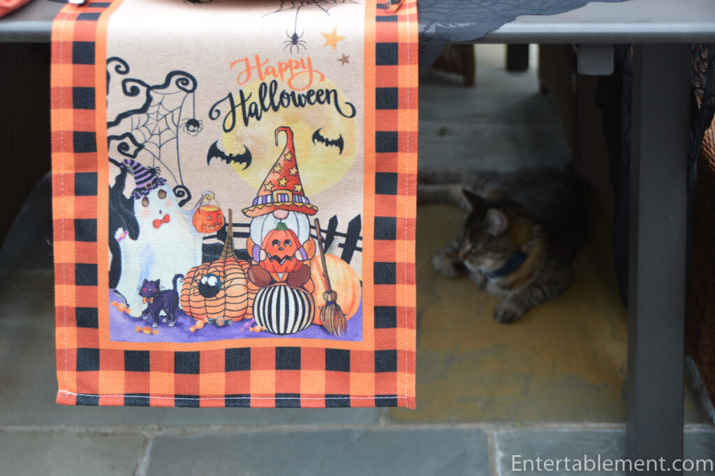 A black cobwebby tablecloth with an orange and black gingham-edged runner formed the base. You can see I had a helper with this table. I think Moxie was afraid I’d slap a costume on her, so she kept herself well hidden under the table.