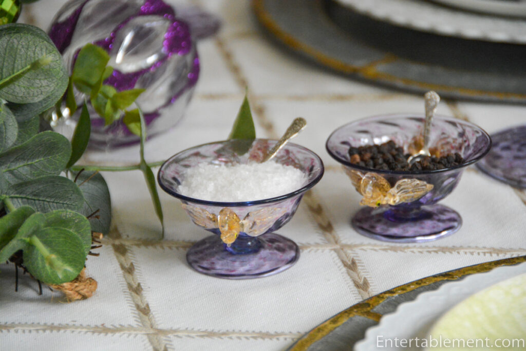 The amethyst Venetian glass open salts are part of the same collection as the goblets and came from Elise Abrams’ antiques.