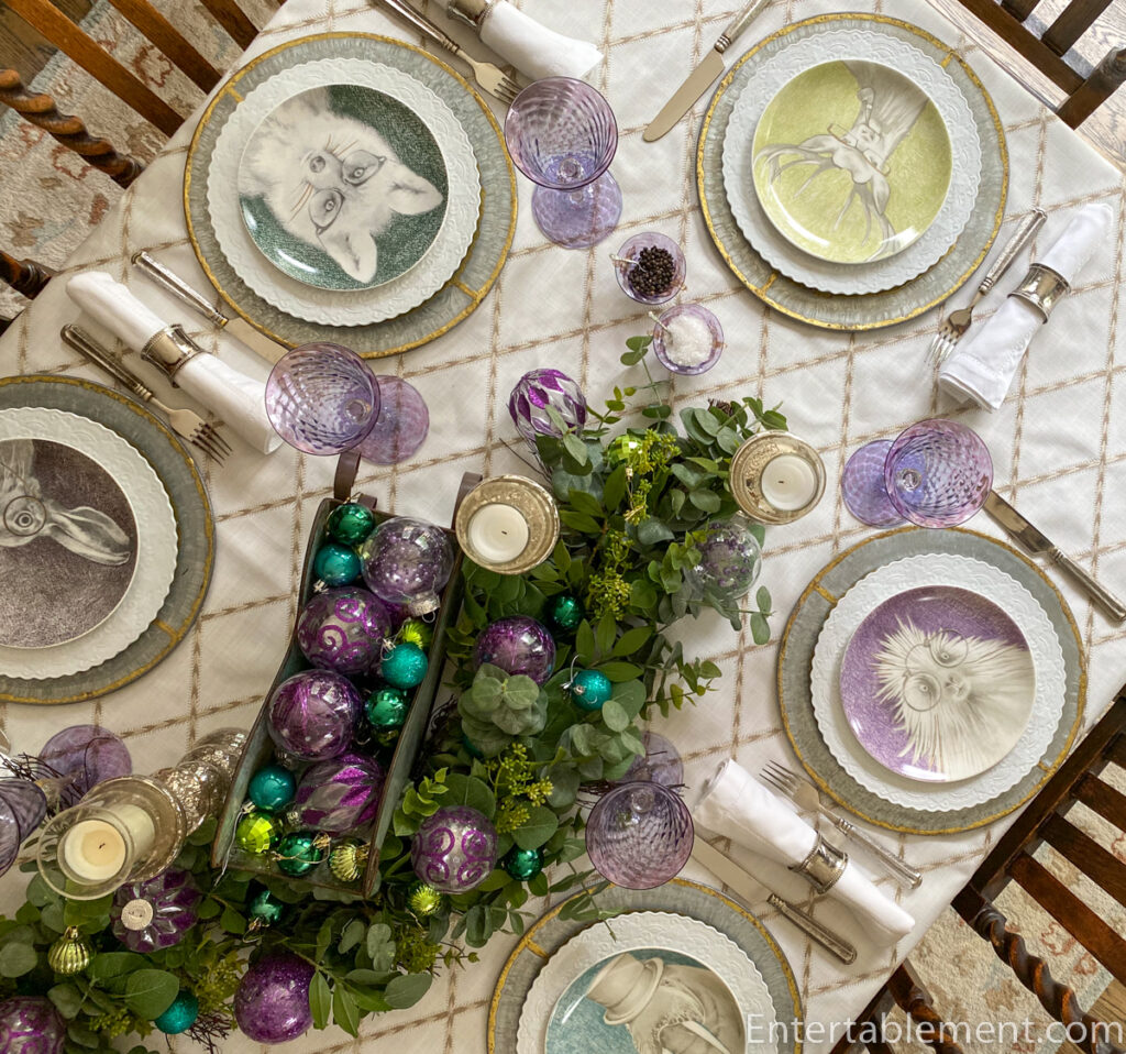 Sounds like you’re now in the Christmas spirit. These plates are the quirkiest and cutest that I have ever seen on your table. The amethyst colored additions are perfect and I’m sure you had fun putting this table together. Enjoy the season!