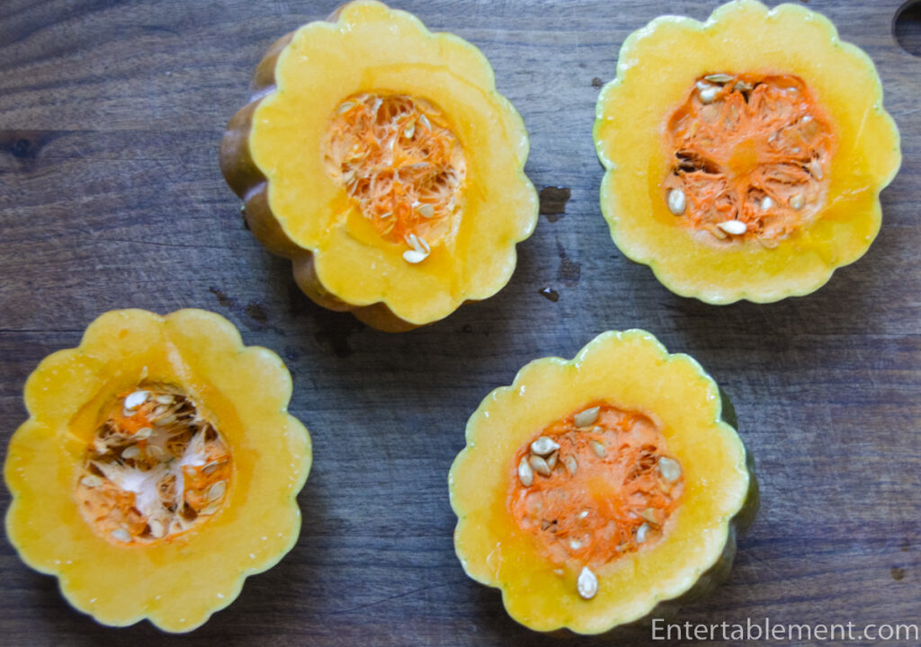 - Scrub the squashes clean. Carefully cut it in half widthwise (across the equator); remove and discard the seeds. Rub the skin of the squash with a little oil, salt and pepper. Place cut side down on the prepared baking sheet and roast until tender but not collapsing. (45-60 minutes).