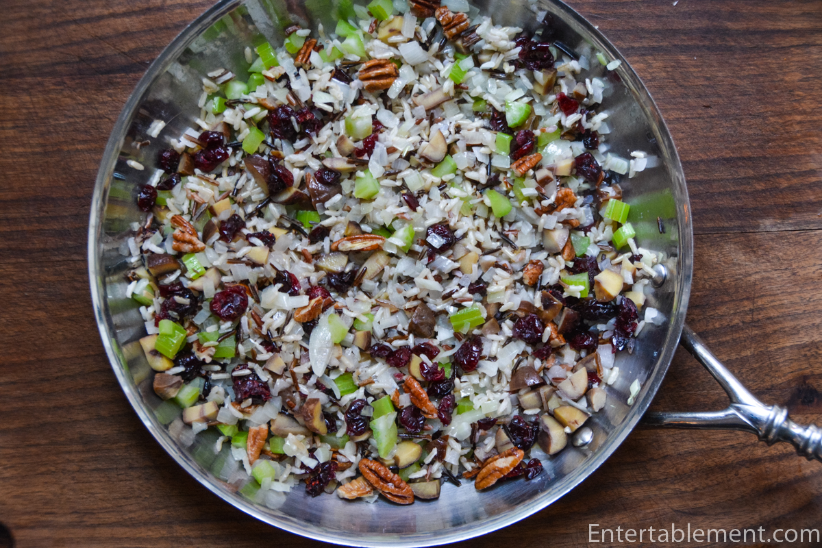 After cooking the rice, I sauteed a small yellow onion and a chopped celery stalk in a large skillet, then added some white wine, chopped vacuum-packed chestnuts, dried cranberries and chopped pecans.