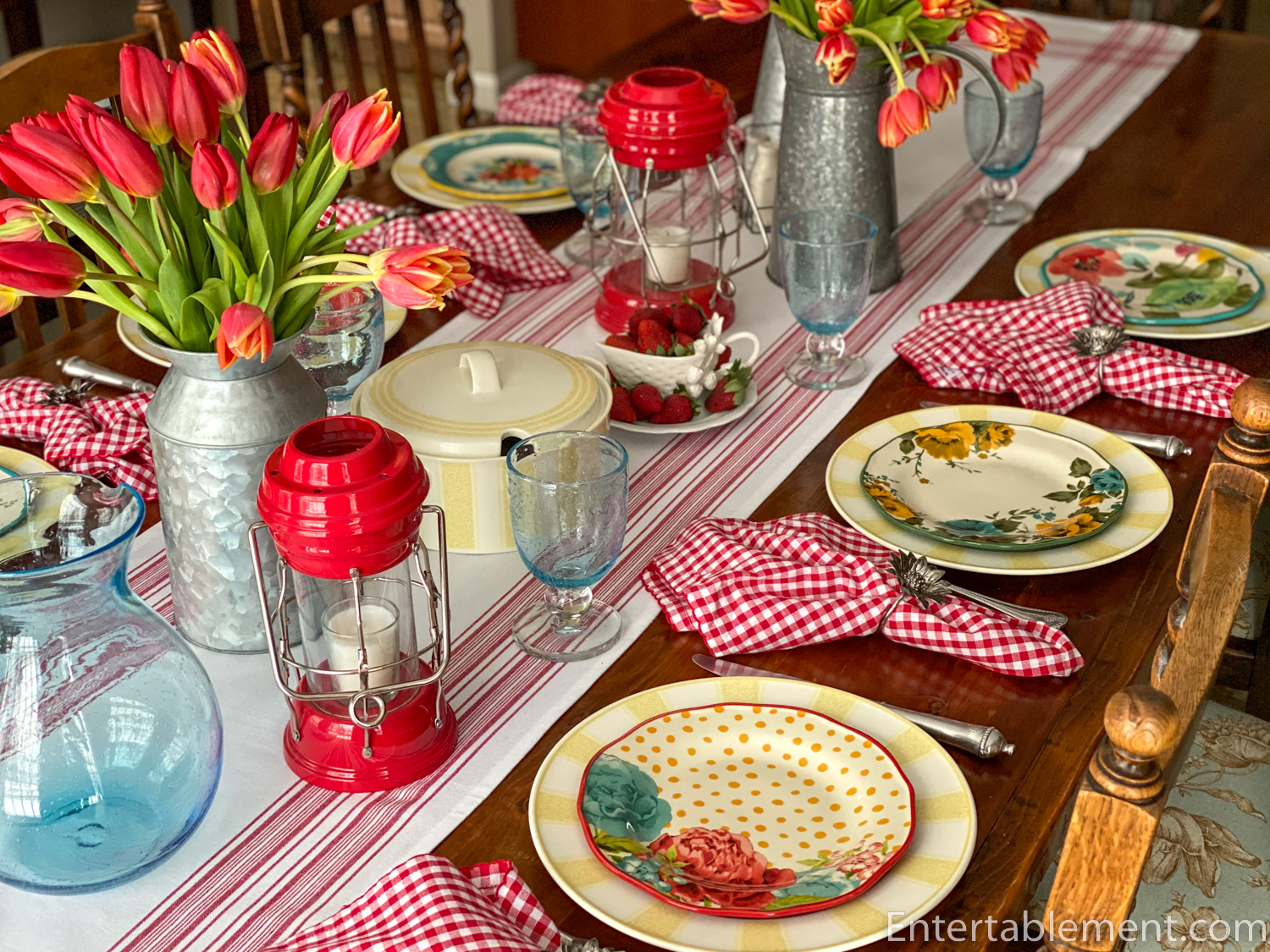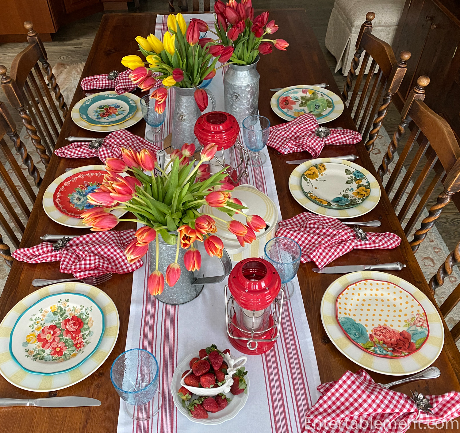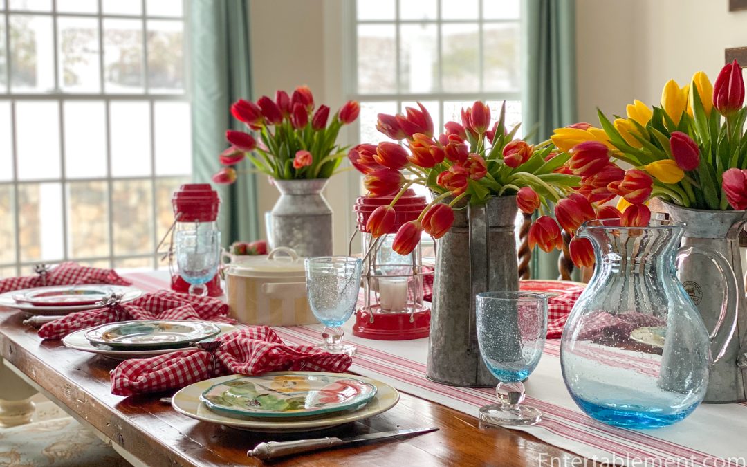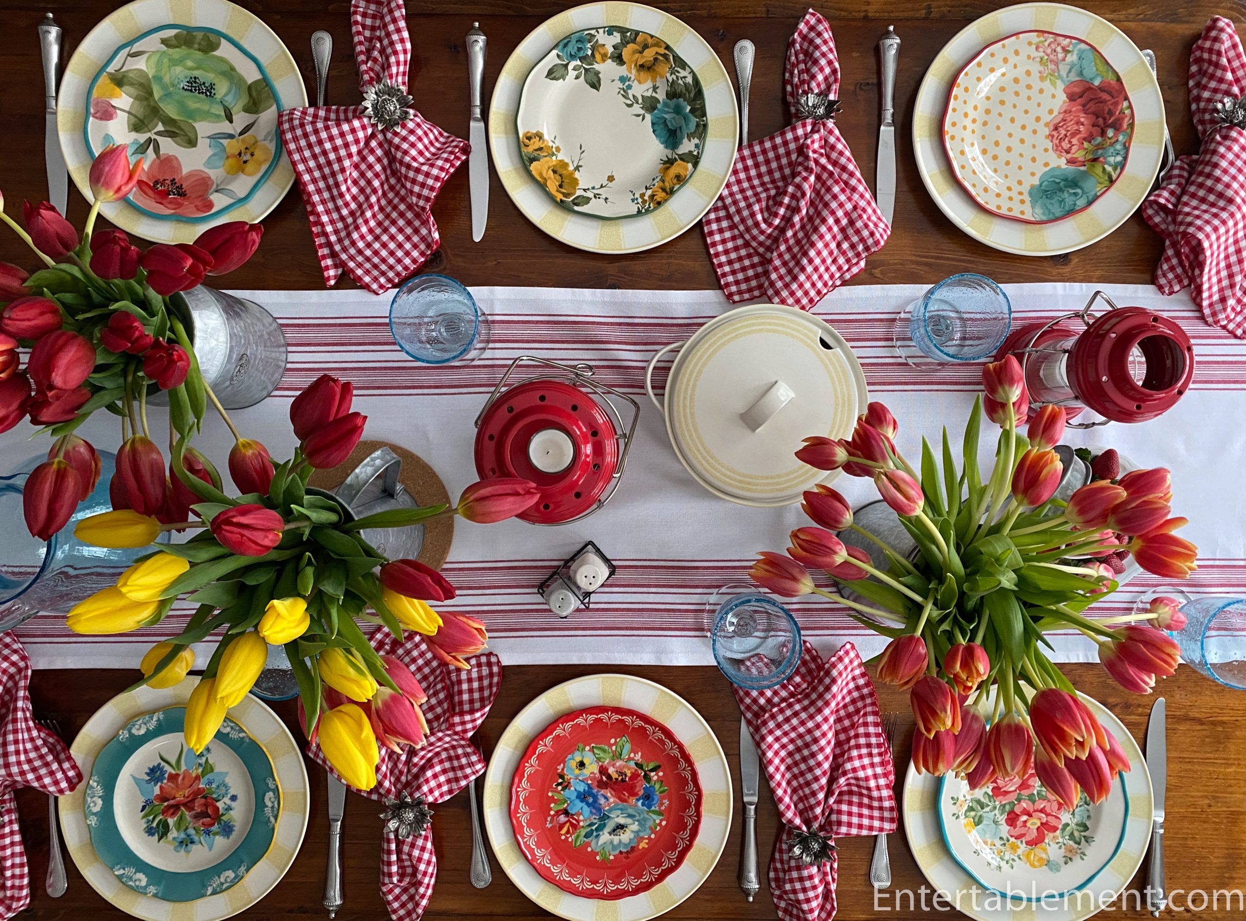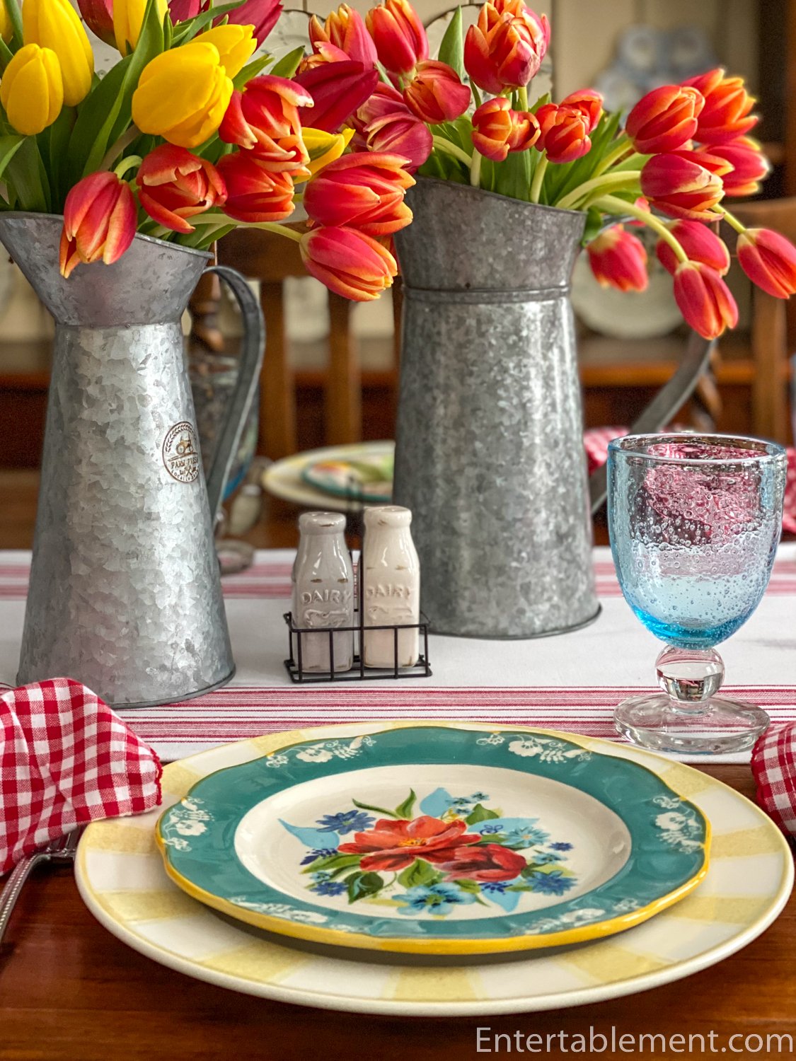 Galvanized jugs hold masses of tulips in red and yellow shades.