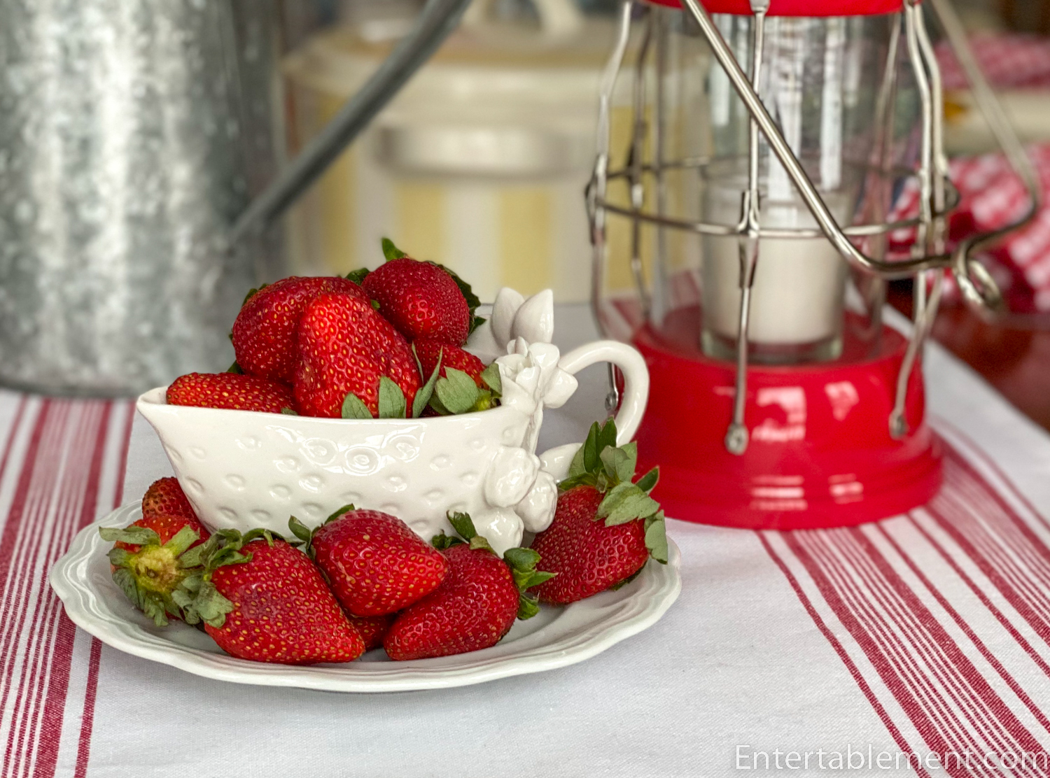 And a little white strawberry creamer from Gracie China overflows with luscious strawberries.
