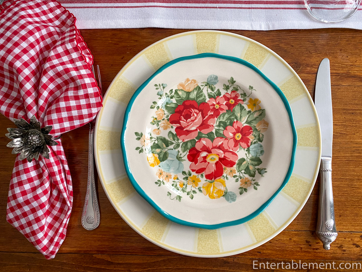 While it could feature in any number of combinations, I elected to begin with Mikasa Broadway Yellow dinner plates and red gingham napkins. The sunflower napkin rings were from April Cornell’s Attic sale a few years ago, another element in the “cheap and cheerful” category.