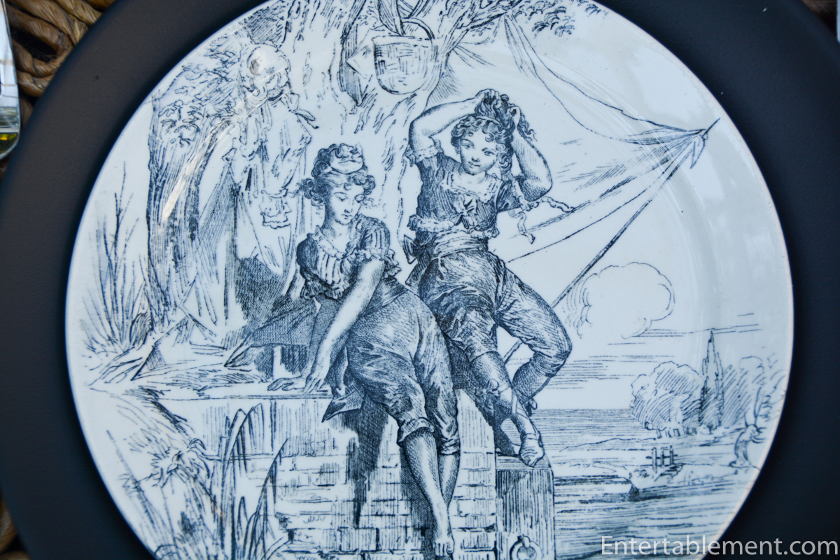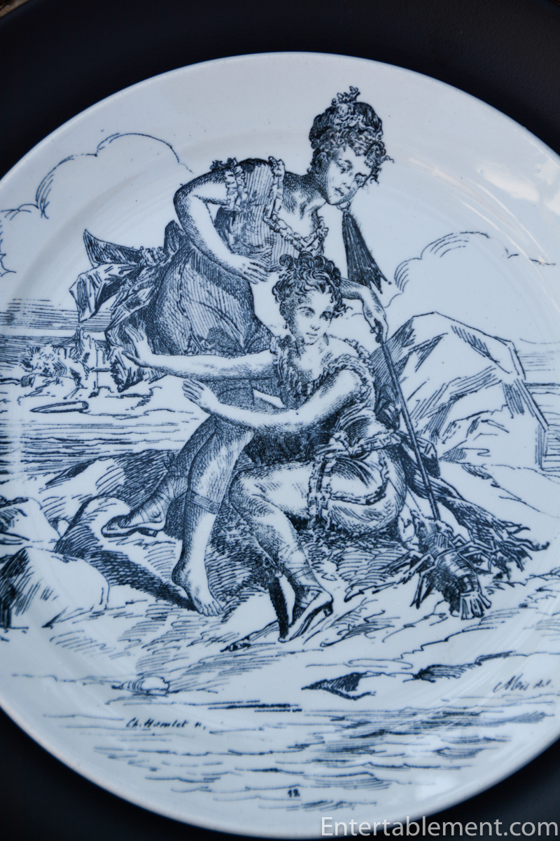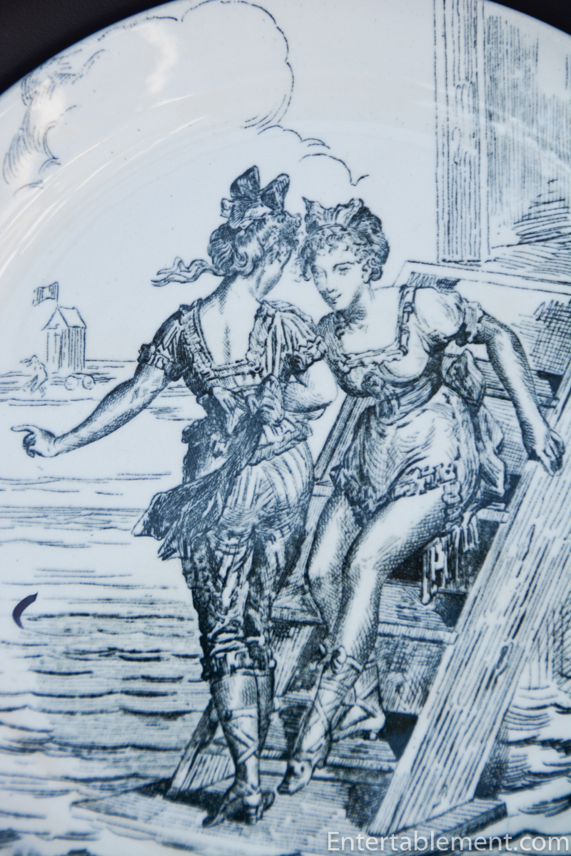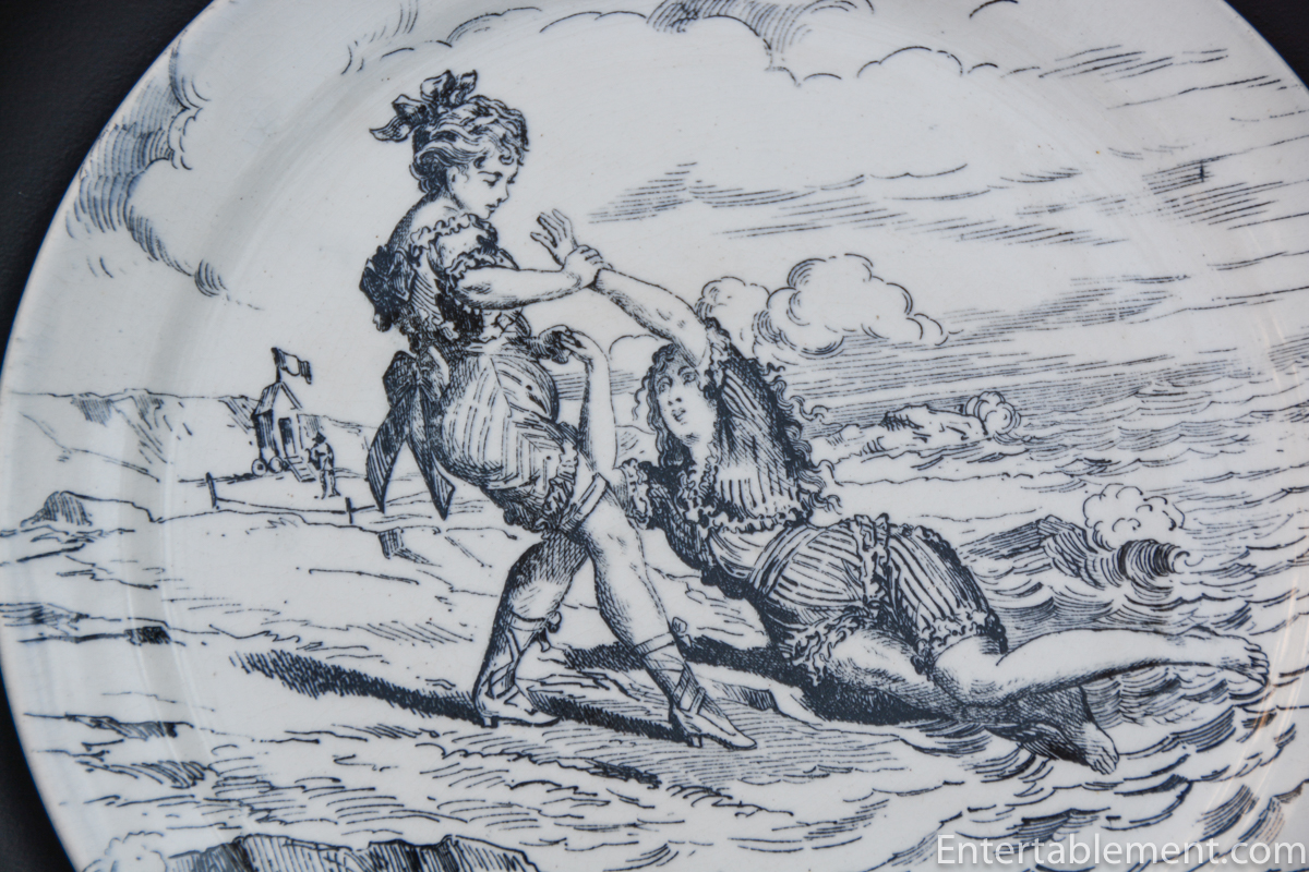 Bains de Mer is a series of twelve 19th-century plates featuring black and white etchings by Charles Hamlet, produced by Creil et Montereau.