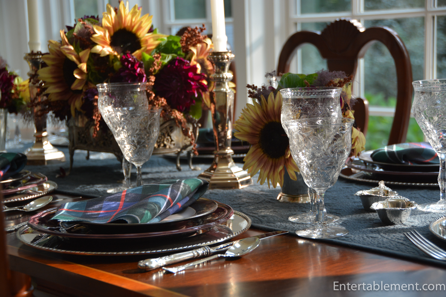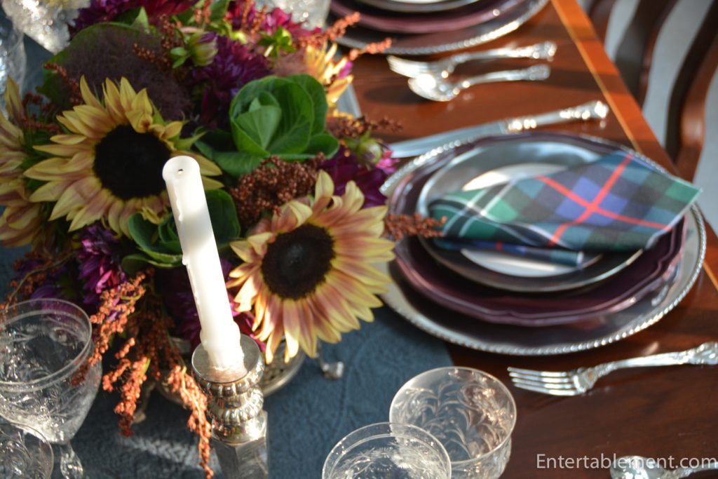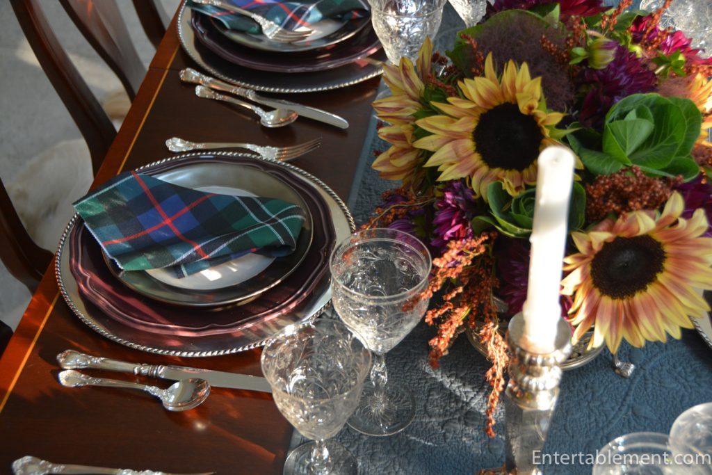 Dear Helen, Ordinarily I have no place in my heart for sunflowers, and these colours really shouldn’t work together, but you’ve done it again. Webb crystal and Rose Hunting Ancient tartan with sterling, Juliska, and purple Ikea?–It’s almost moody…I’d like to see what would happen if you substituted another flower for the sunflowers…it could change the entire thing! Hope your turkey hunt goes well. Do we get some shots of the day? Today our tree’s hazelnut harvest is going into my yearly Hungarian Torte extravaganza, which starts with shelling and roasting a pound of nuts–a labour of love to celebrate fall. Happy Turkey!