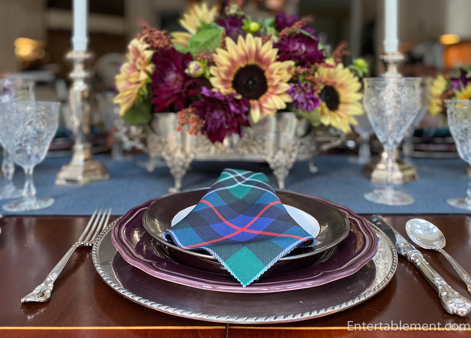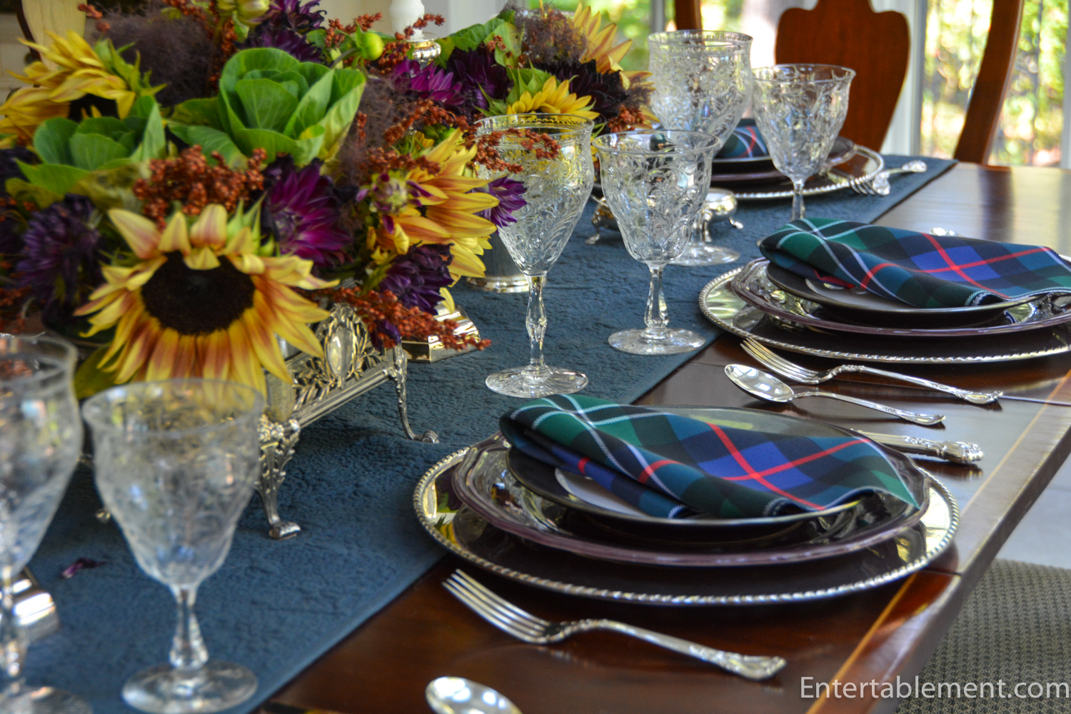 I decided to run with the jewel tones and used dark tartan napkins and a deep blue runner.