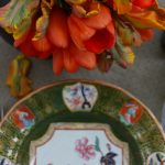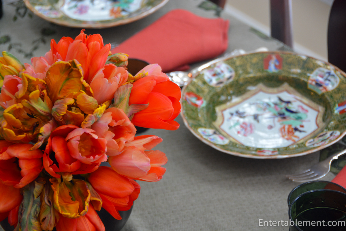 With a bunch of shockingly orange parrot tulips to hand, I was inspired to set a table. One day, I might try emphasizing the aqua and pink colours. But for now, let’s run with the orange.