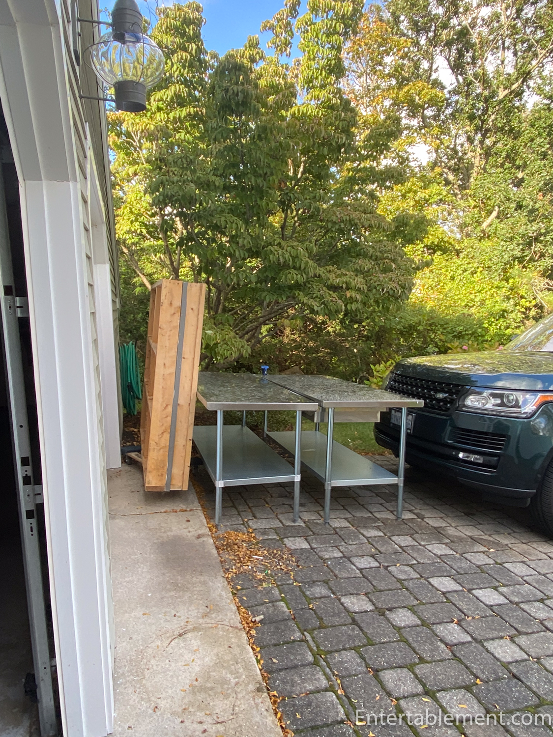 The wooden steps from the garage to the house had to be removed, along with our respective stainless work benches. They spent a few days out of doors.