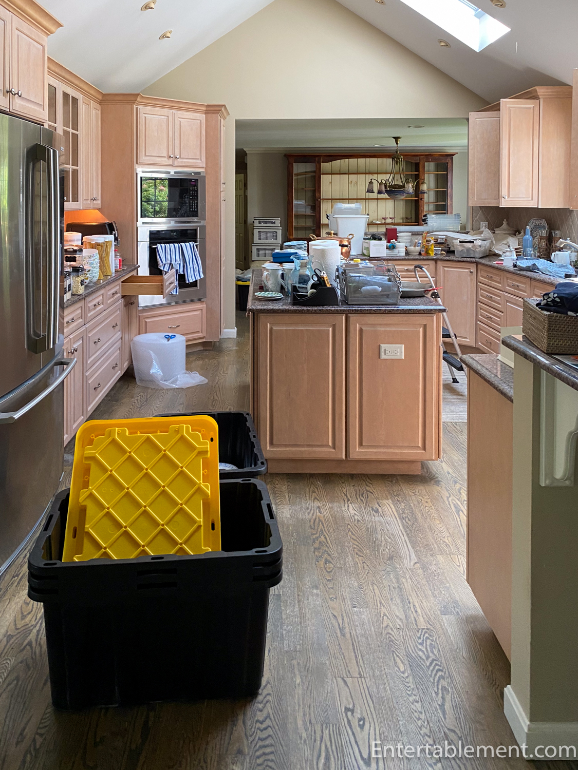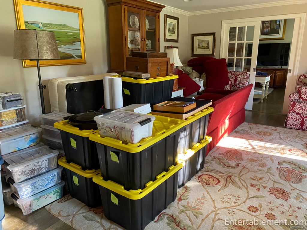 Next up––a kitchen and laundry room reno here on the Cape. We are waiting for a permit, but we have packed up the kitchen and dining room in the meantime. Glenn went off to Home Depot and picked up a bunch of stackable containers and a roll of bubble wrap. It’s much cheaper than getting in movers and less trouble than cardboard boxes.