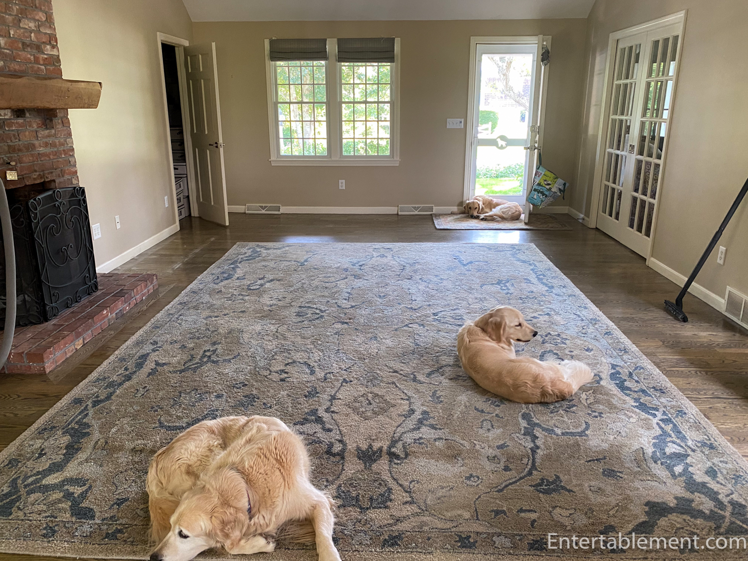 The dogs are thrilled to have such a large play area in the family room. The kitchen reno will necessitate the floors being refinished in here, so everything had to go.